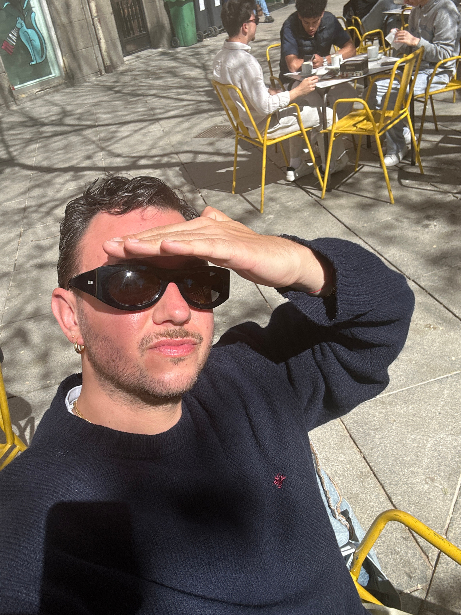 The image depicts a man wearing sunglasses and a navy sweater in Madrid, Spain. He is seated outdoors, shielding his eyes with his hand. In the background, other people are seated at yellow chairs and…read more