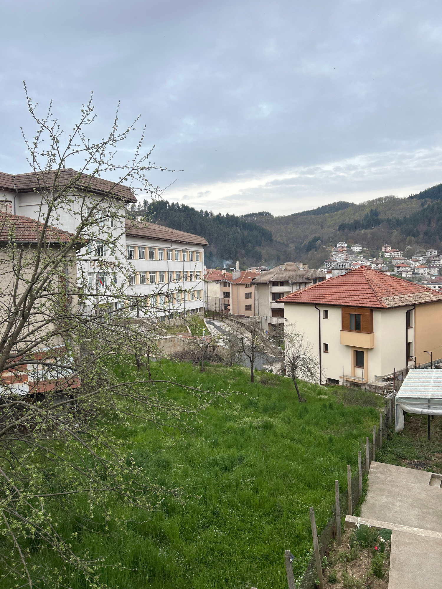 The image shows a view in Zlatograd, Bulgaria, featuring a cityscape nestled against a backdrop of forested mountains. The sky is overcast. Several buildings of varying heights and architectural style…read more