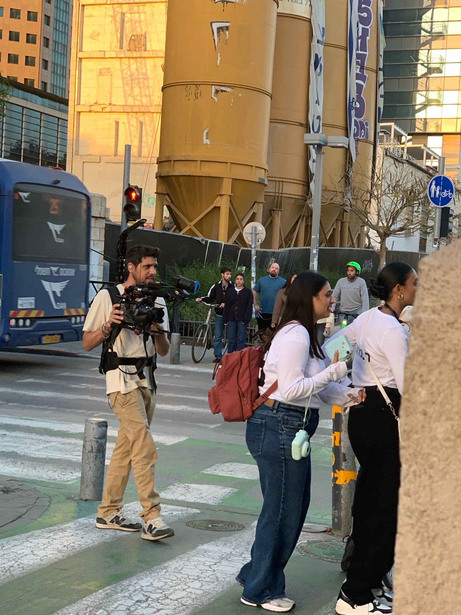 The image shows a street scene in Tel Aviv, Israel. A cameraman stands in a crosswalk, operating a professional camera rig with a blue bus behind him. Two young women, one with a blue camera on her je…read more