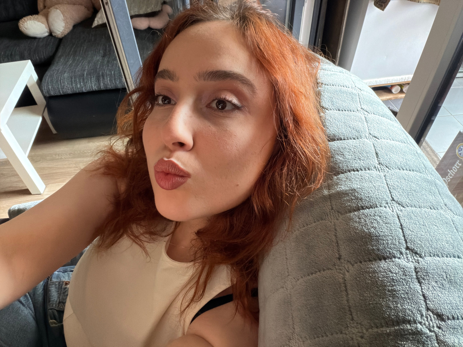 A young woman with reddish-brown hair is depicted in a close-up selfie, oriented as if lying down and looking up at the camera. She has light skin, defined eyebrows, and dark eyes, with her lips sligh…read more
