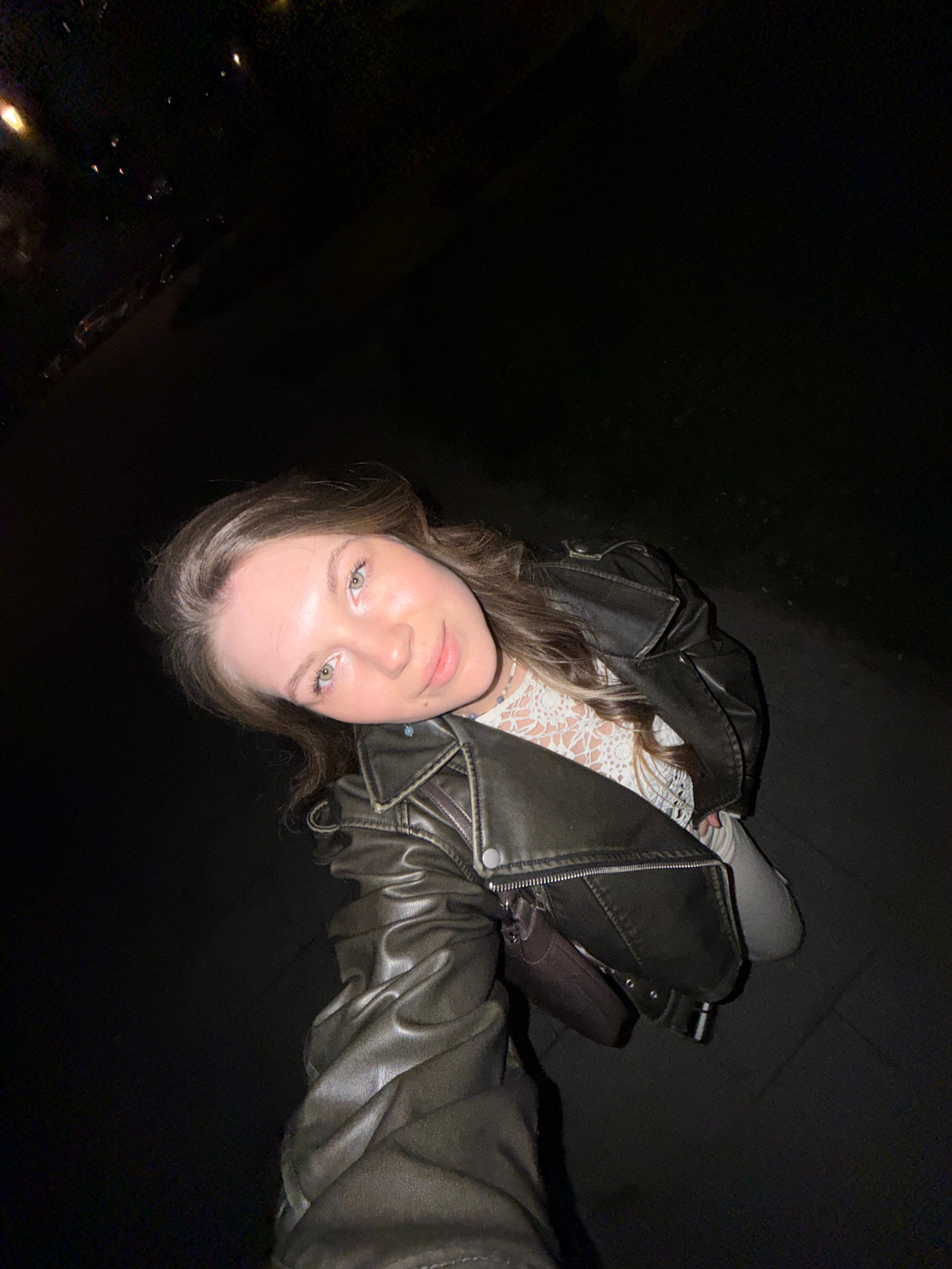 A young woman is posing for a selfie at night in Belgrade, Serbia. She is wearing a brown leather jacket and a white lace top. The image is taken at night, and the background is dark. In the lower lef…read more