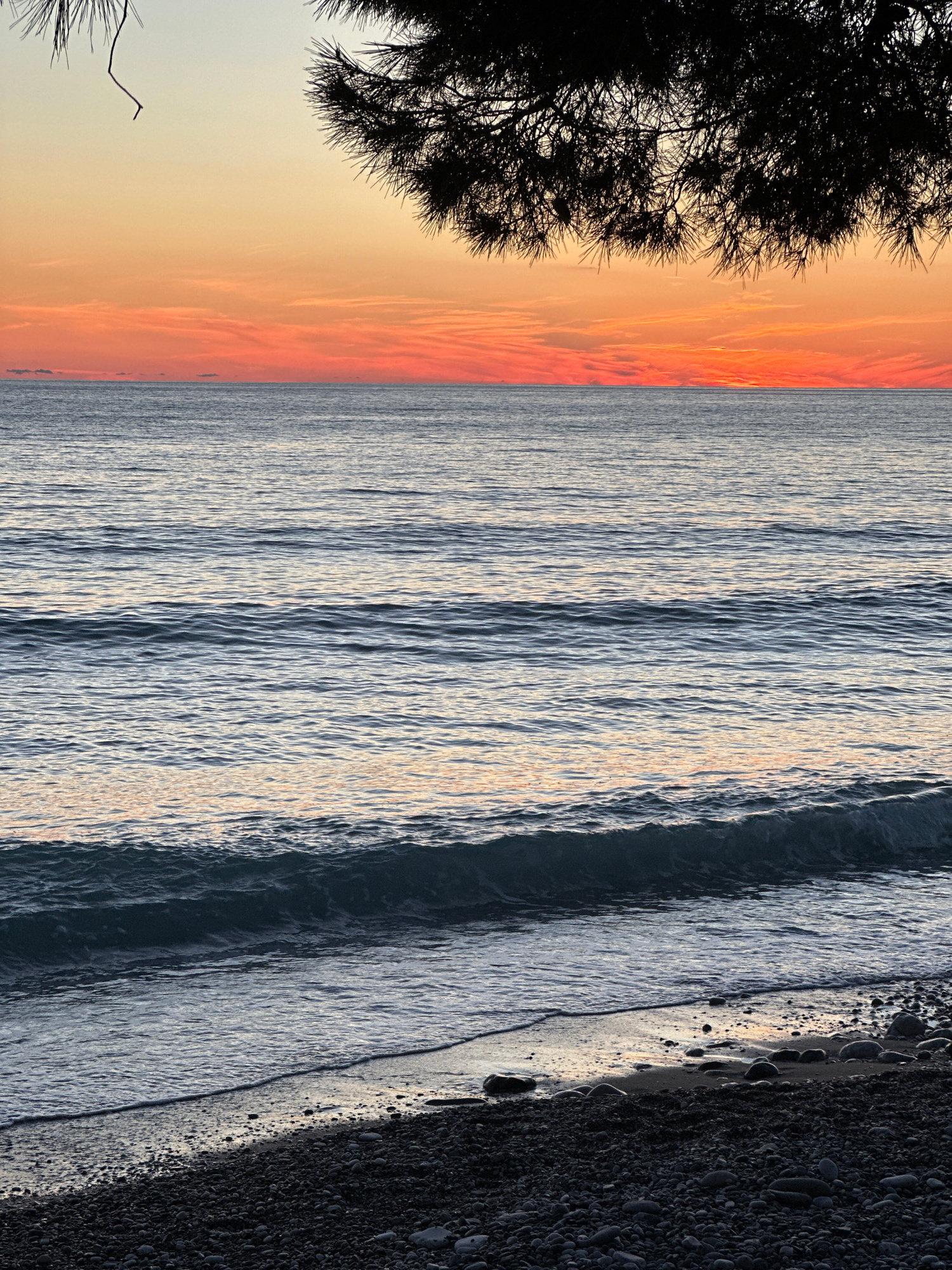 The image depicts a seascape at sunset, likely in Šušanj, Montenegro. The left side of the image shows the silhouette of a tree against an orange and yellow sky. The center of the image is dominated b…read more