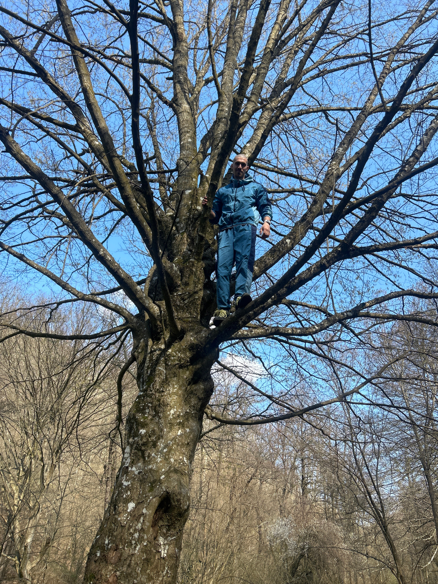 A man in denim clothing is lying on a thick tree branch in Mladezhko, Bulgaria. The tree is mostly bare of leaves, with many branches against a blue sky. Other bare trees are visible in the background…read more