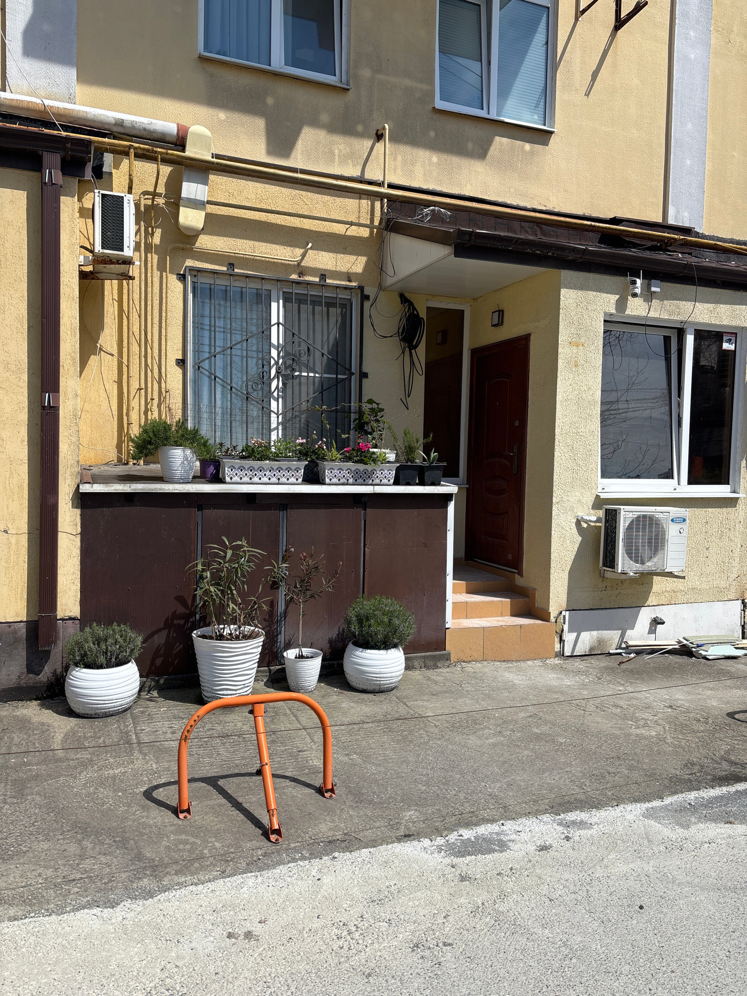 The image depicts the facade of a building in Sochi, Russia, as suggested by architectural style and climate. The building is two-story and painted yellow. There are windows on both floors, with a sec…read more