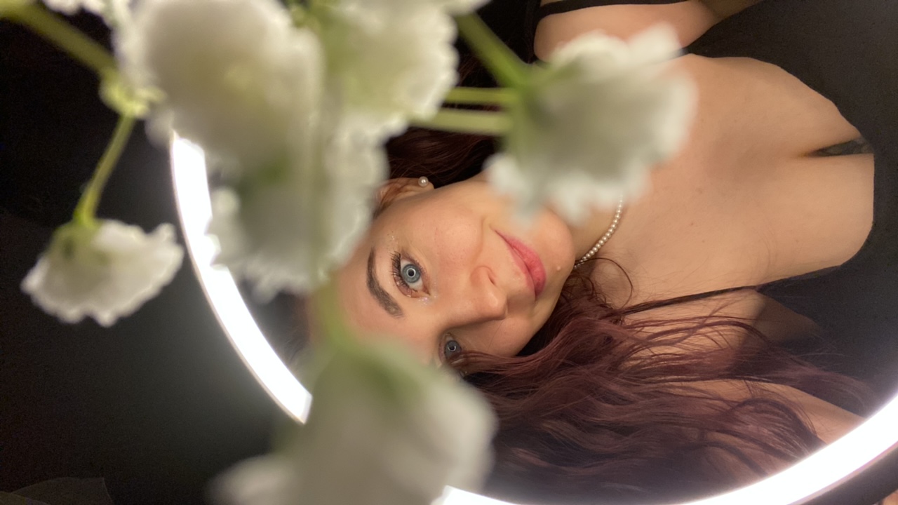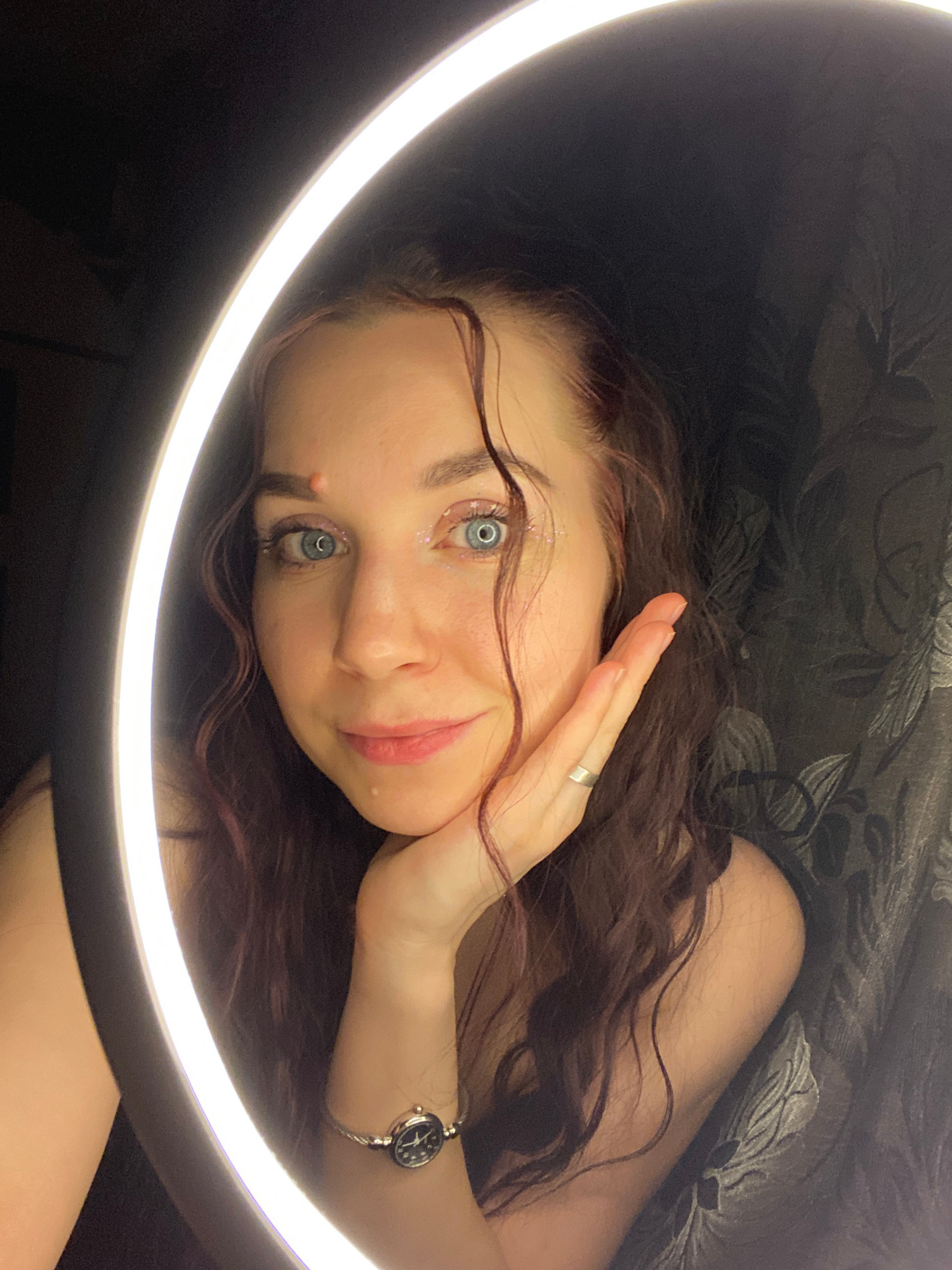A woman with long, wavy brown hair is posing in what appears to be an indoor setting. Her eyes are light blue and she has glitter makeup around them. She's wearing a silver ring on her finger and a sm…read more