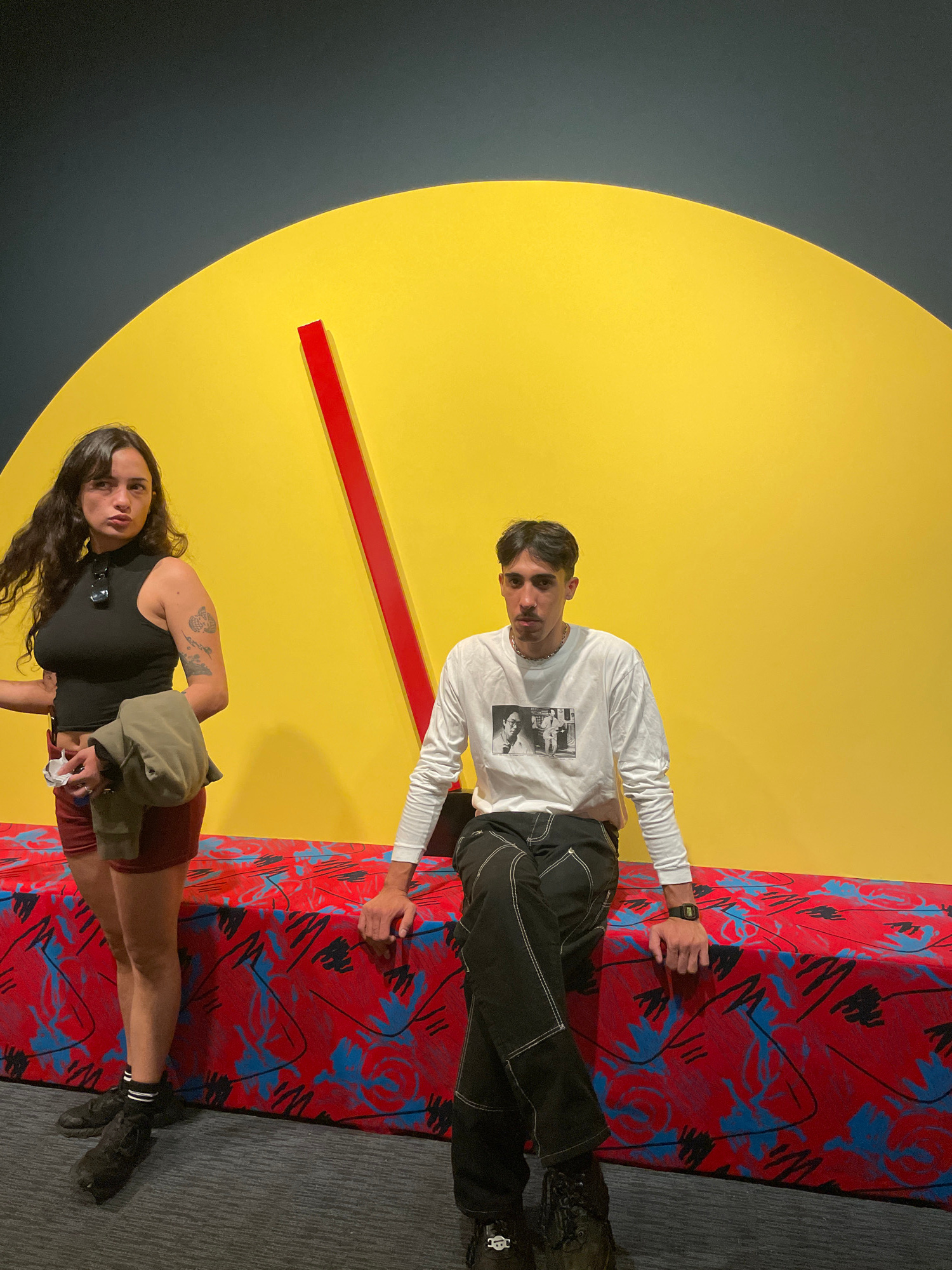Two individuals, a man and a woman, are indoors in what appears to be an art installation or exhibit. The background features a large yellow circle with a red line extending from the center, resemblin…read more