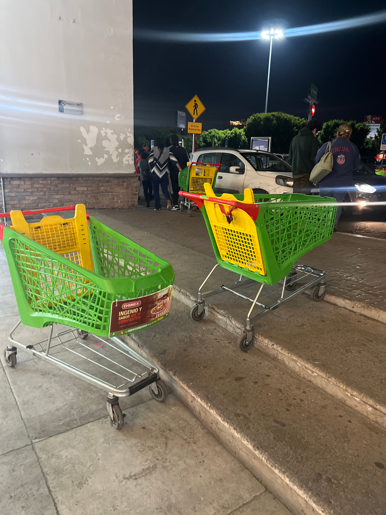 The image is an outdoor night shot, likely taken in the city of Cholula, Mexico. The primary subjects are two shopping carts, each constructed of a green plastic outer frame with a yellow plastic inne…read more