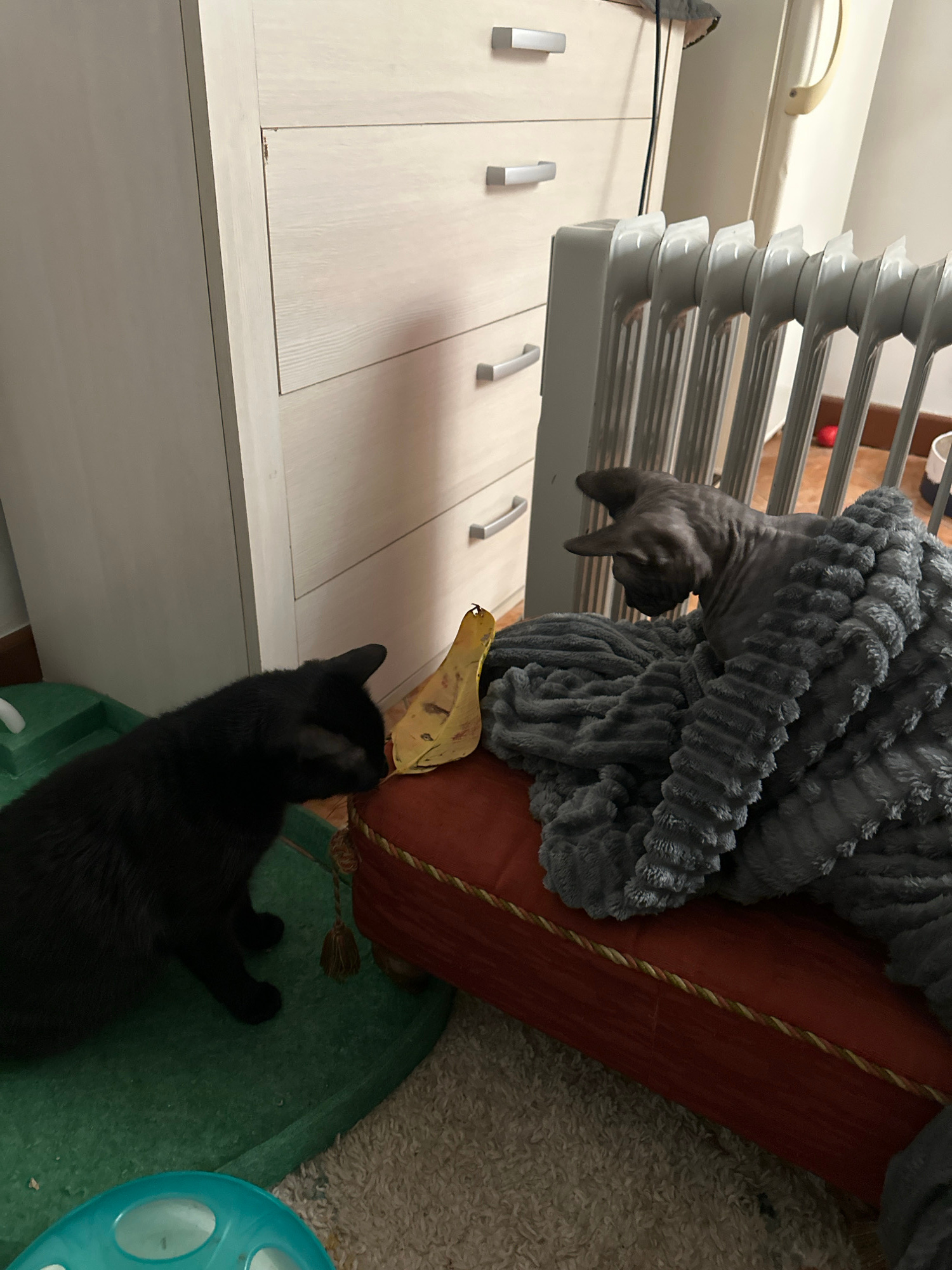 Two cats are in a room. One cat, gray, is draped over a gray, textured blanket and a reddish-brown bolster. The second cat, black, is on the floor in front of the first. A yellow leaf is near the two…read more