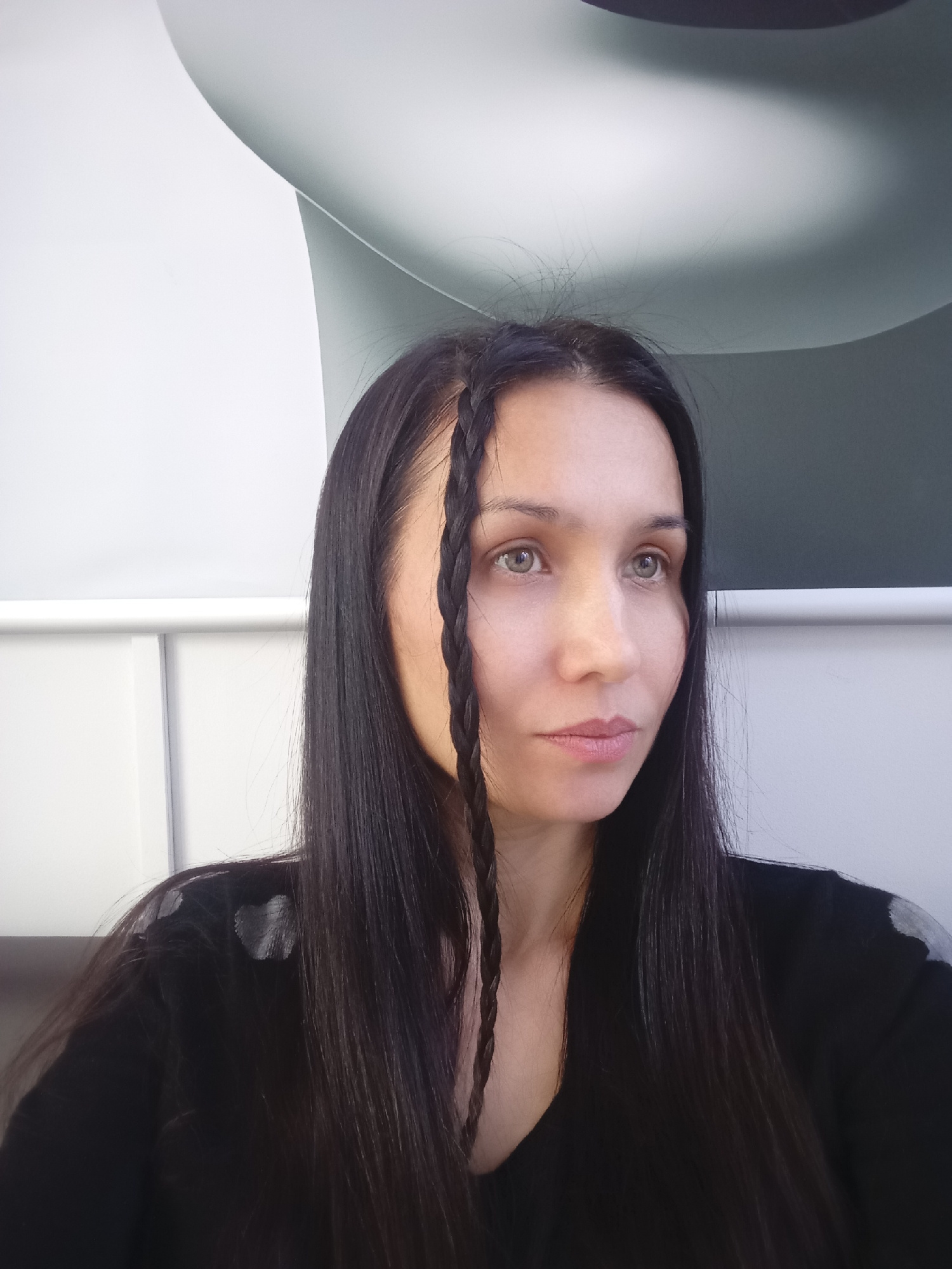 This is a medium close-up portrait of a woman photographed indoors. She has long, dark, straight hair, featuring two distinct braids that frame the left side of her face. Her light-colored eyes, appea…read more