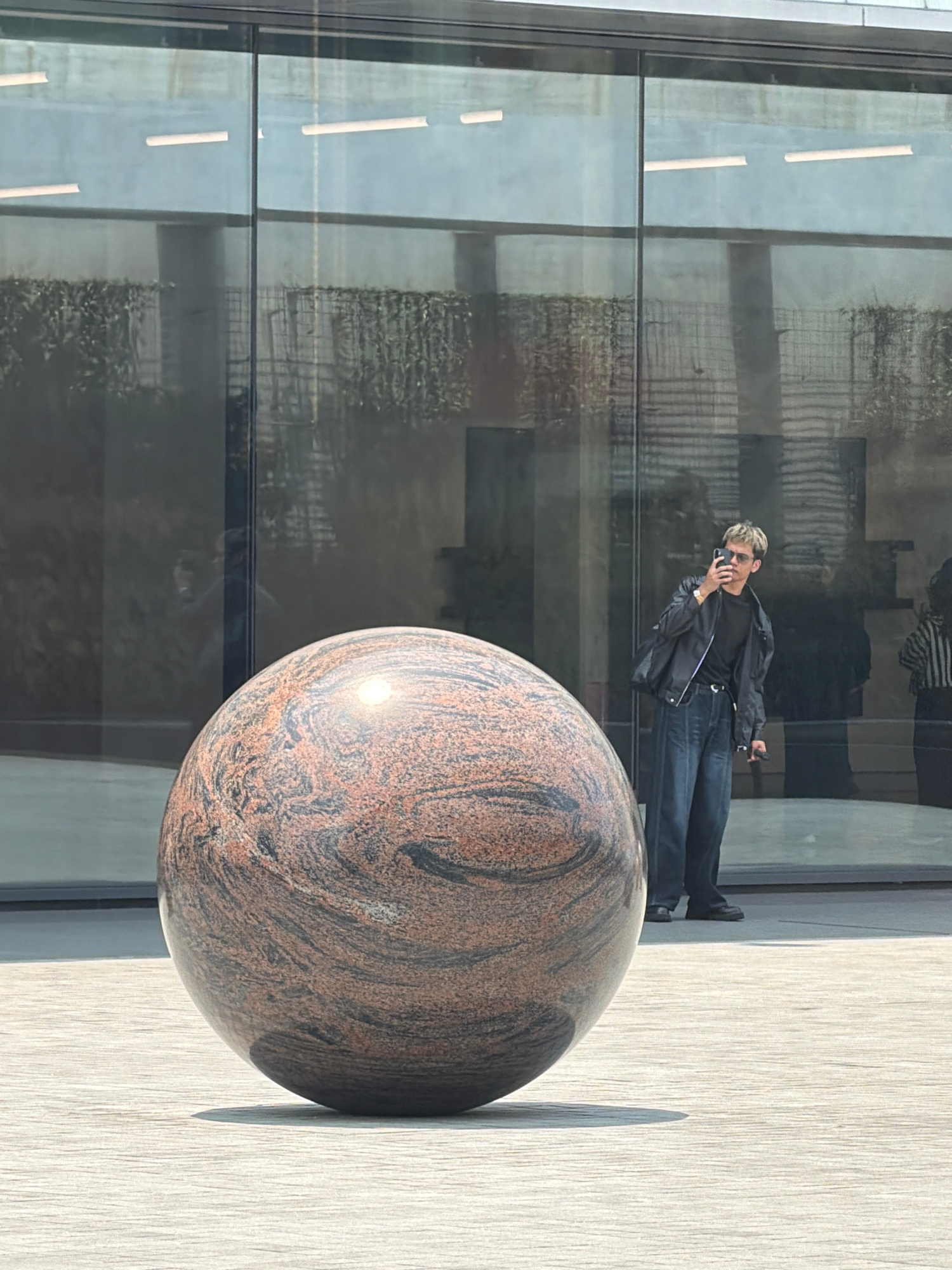A horizontally-oriented medium shot features a large granite sphere situated in front of a modern glass building. To the upper left, a man in a black jacket and dark jeans is seen speaking on his cell…read more