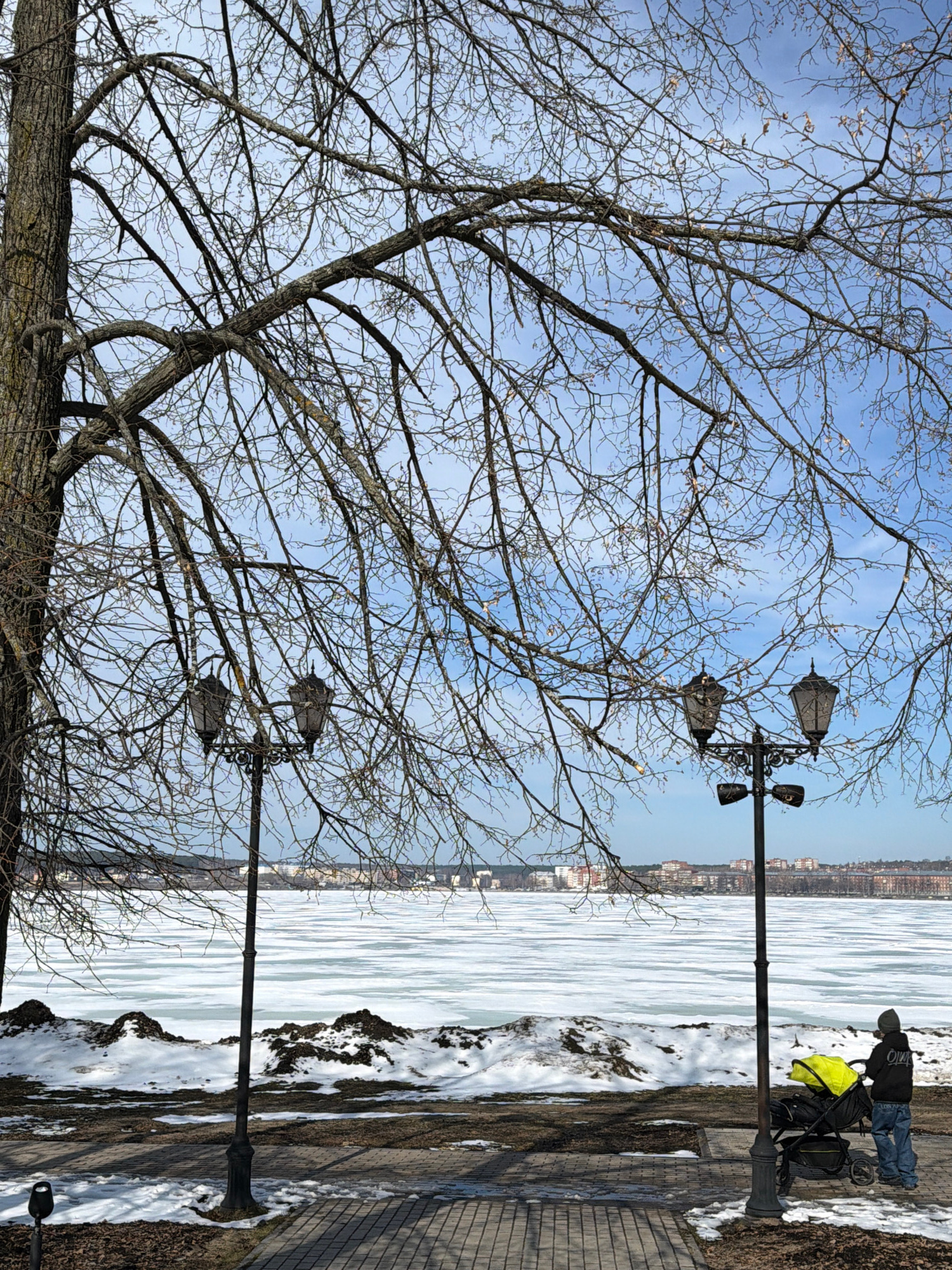 The image depicts a winter scene in Votkinsk, Russia, along the embankment of the Votkinsk Reservoir. A leafless tree dominates the left side of the frame, its branches silhouetted against a light blu…read more