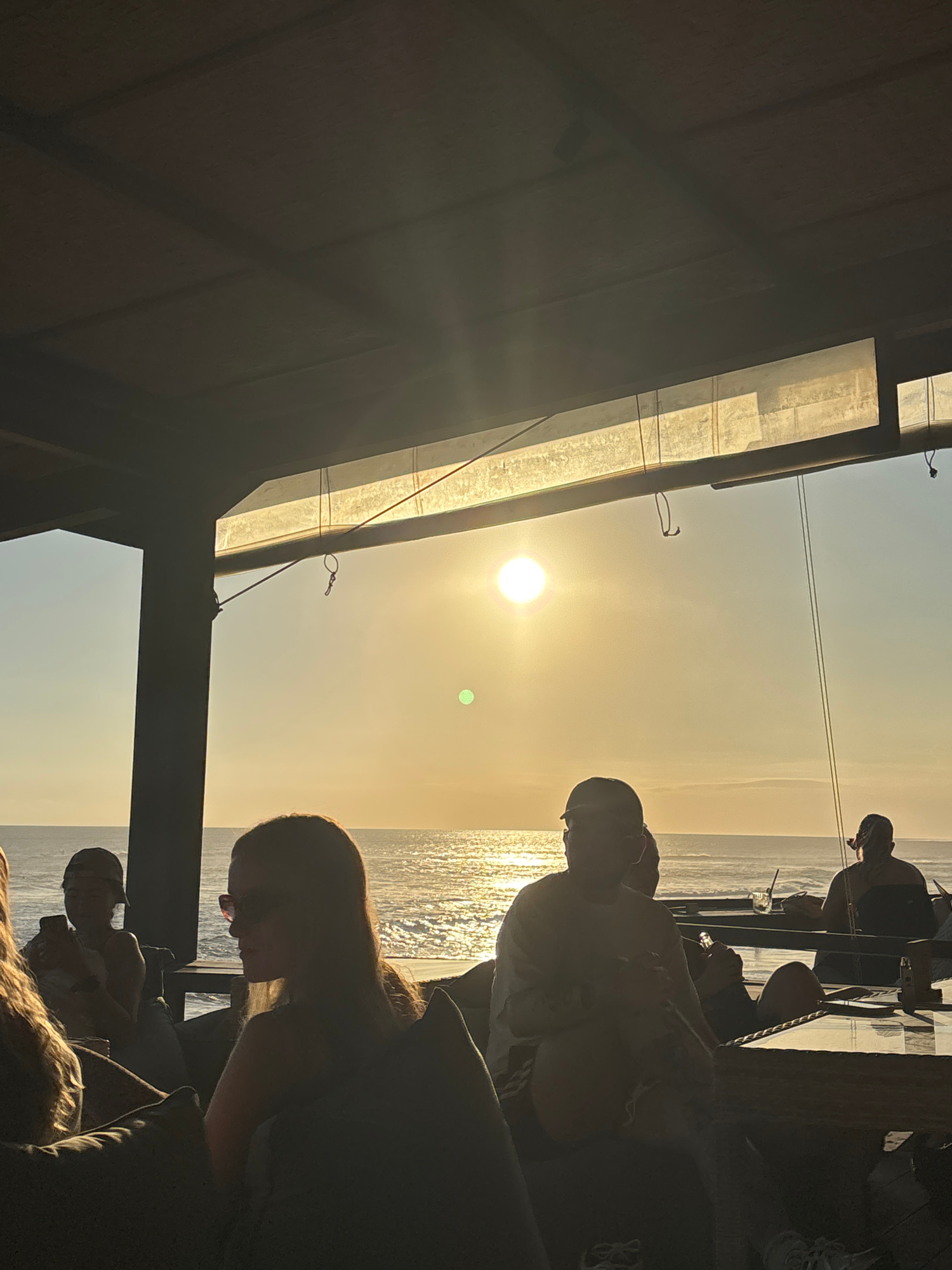 The image captures a group of people on a boat at sea during a sunset in North Kuta, Indonesia. The sun is positioned in the upper center of the frame, emitting a bright glare. A green spot appears as…read more
