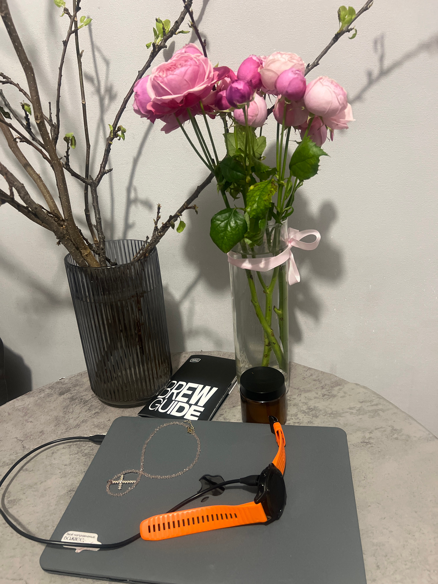The image depicts a tabletop scene, likely indoors, featuring a laptop, vases with flowers, and various accessories. A grey laptop, possibly a MacBook, is positioned on the right side of the frame, w…read more