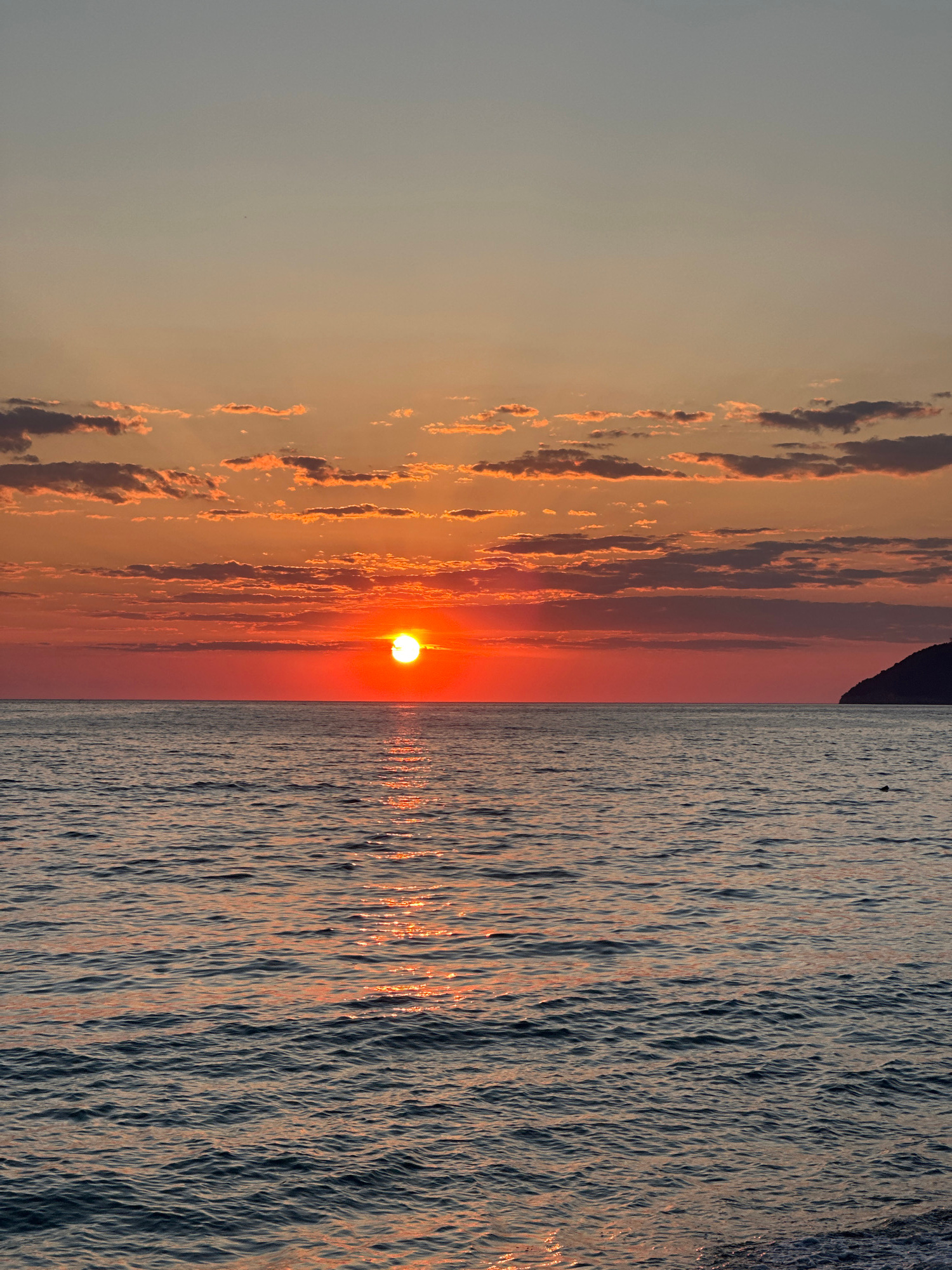 The image shows a sunset over the Adriatic Sea near Šušanj, Montenegro. The sky is partially cloudy with the sun setting in the center of the frame. The water is slightly choppy, reflecting the sunlig…read more