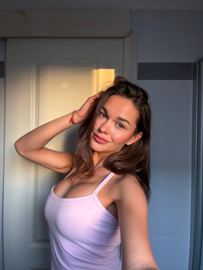 An indoor, close-up portrait depicts a woman in her late 20s or early 30s, positioned against a light-colored background. The scene is depicted indoors in Tel-Aviv, Israel. She possesses medium-brown…read more