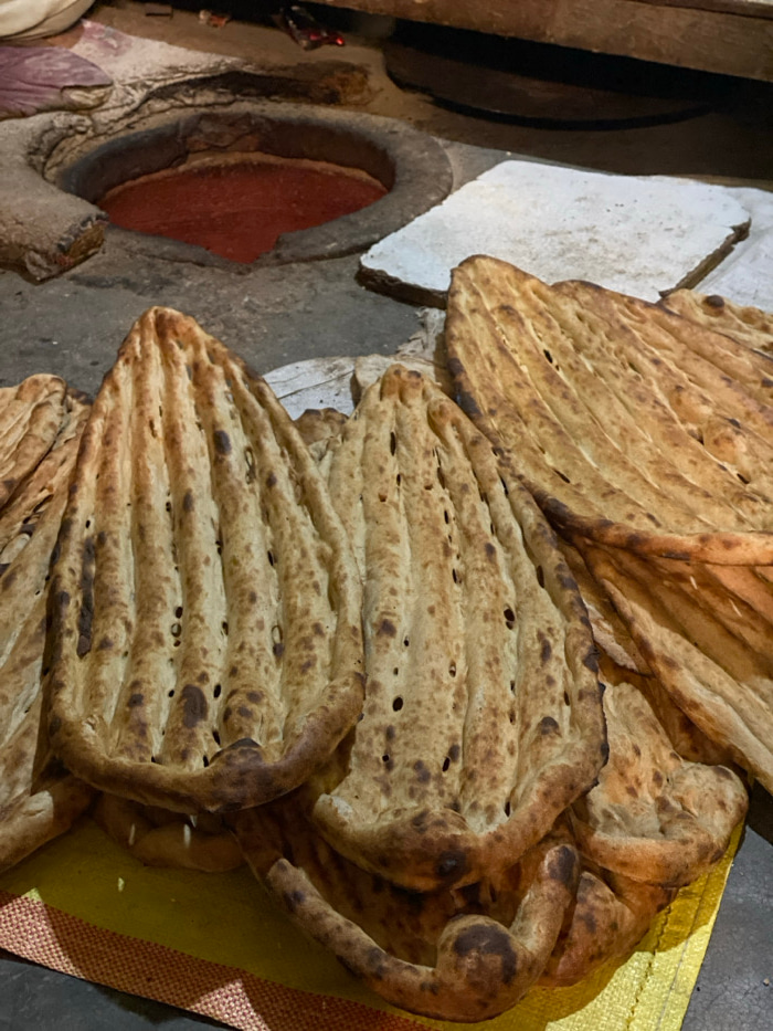 A stack of freshly baked naan bread rests near a traditional clay oven. The bread is characterized by its golden-brown color, elongated shape, and distinctive rows of indentations. Some pieces exhibit…read more