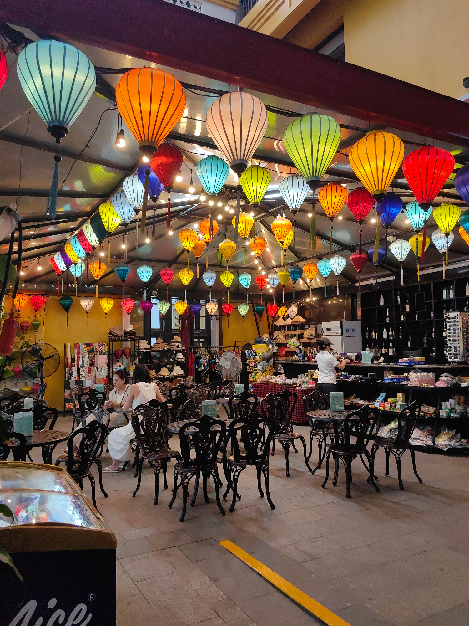 An indoor setting, possibly a restaurant or shop, in Bai Chay Ward, Vietnam is filled with colorful lanterns hanging from the ceiling. Tables and chairs occupy the foreground. Two women are seated at…read more