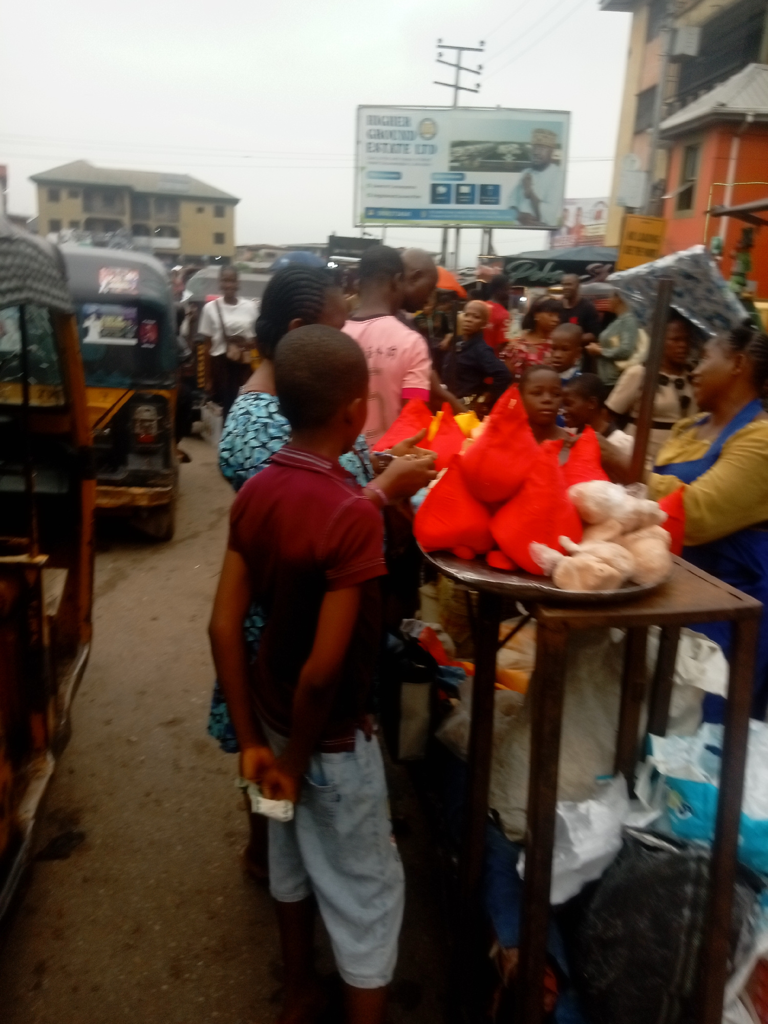 On a cloudy day in Onitsha, Nigeria, a bustling street scene unfolds. A young boy in a red shirt and light-wash shorts stands near a makeshift food stall. The stall, constructed from dark metal, displ…read more