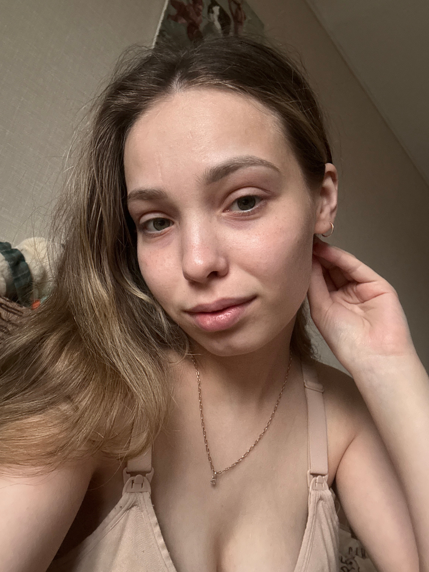 This media file presents a close-up portrait of a young woman, captured from a high angle as she lies down and looks directly at the camera. The image is rotated 90 degrees clockwise. The woman, ident…read more