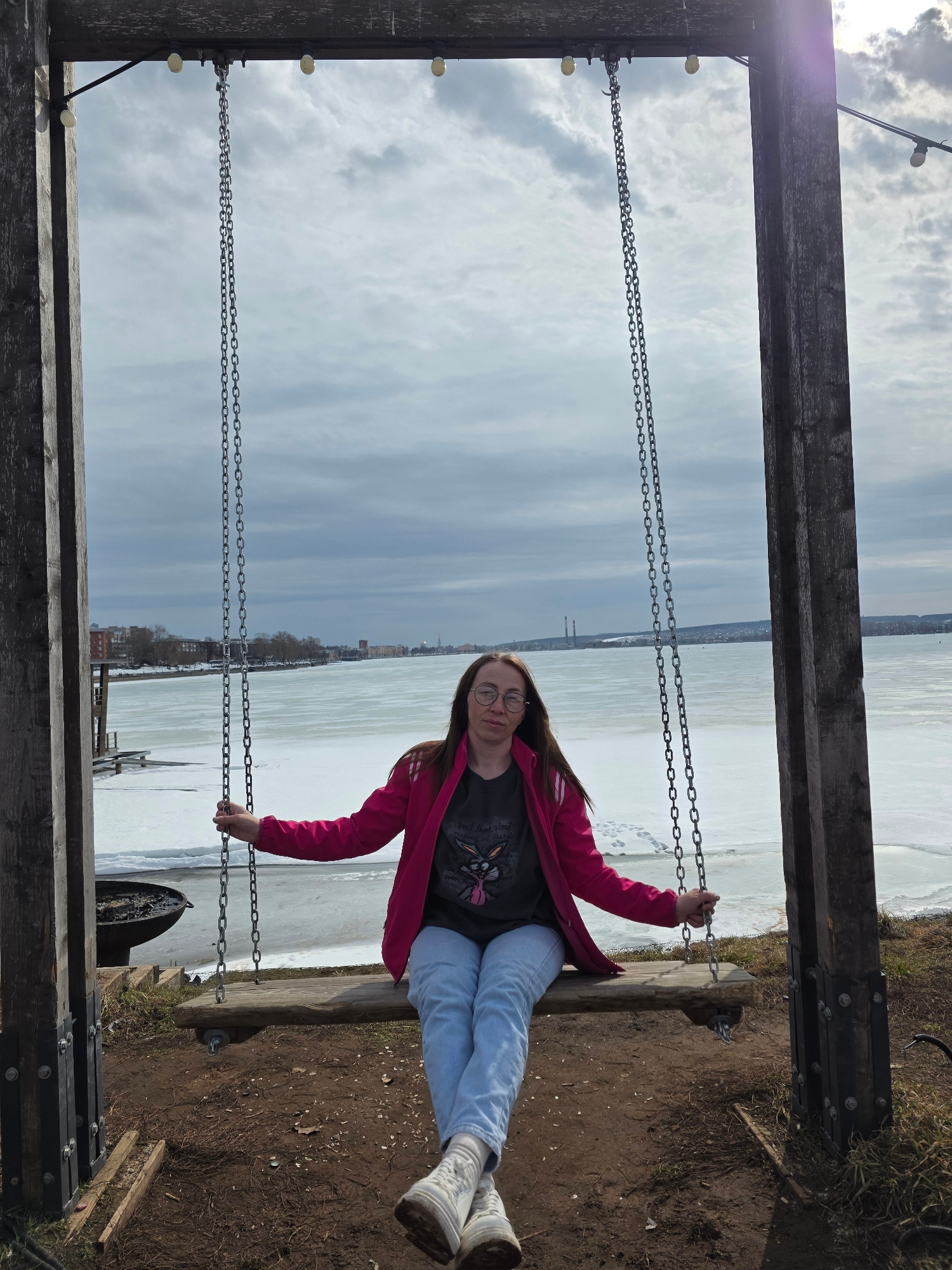 A young woman is sitting on a swing set near a body of water covered in ice, likely in the city of Votkinsk, Russia. She is wearing glasses, a t-shirt, a pink jacket, blue jeans, and white sneakers. T…read more