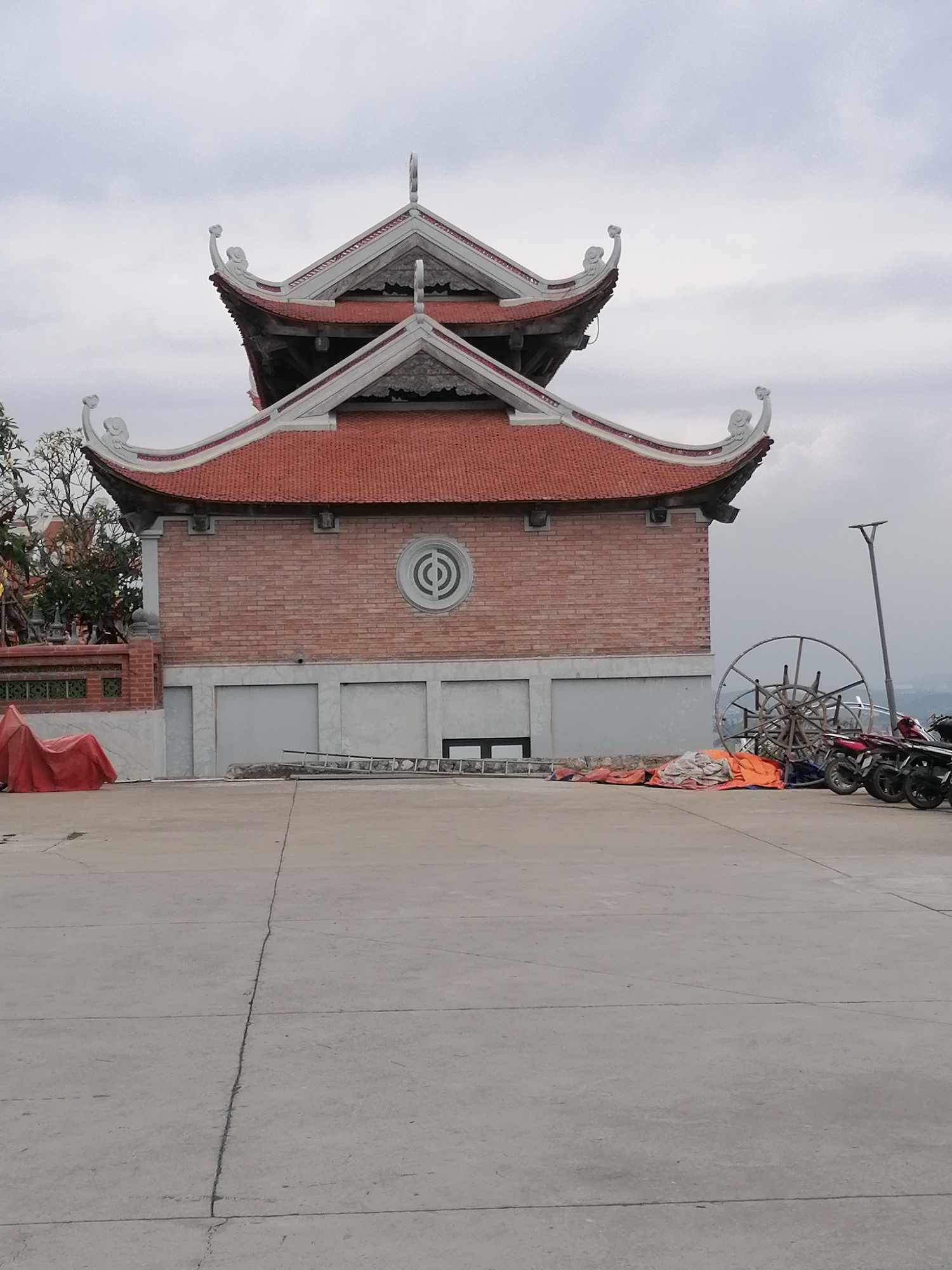 This image captures a two-story building with traditional East Asian architectural elements, resembling a temple or pagoda, under a uniformly grey, overcast sky in Hong Gai Ward, Vietnam. The building…read more