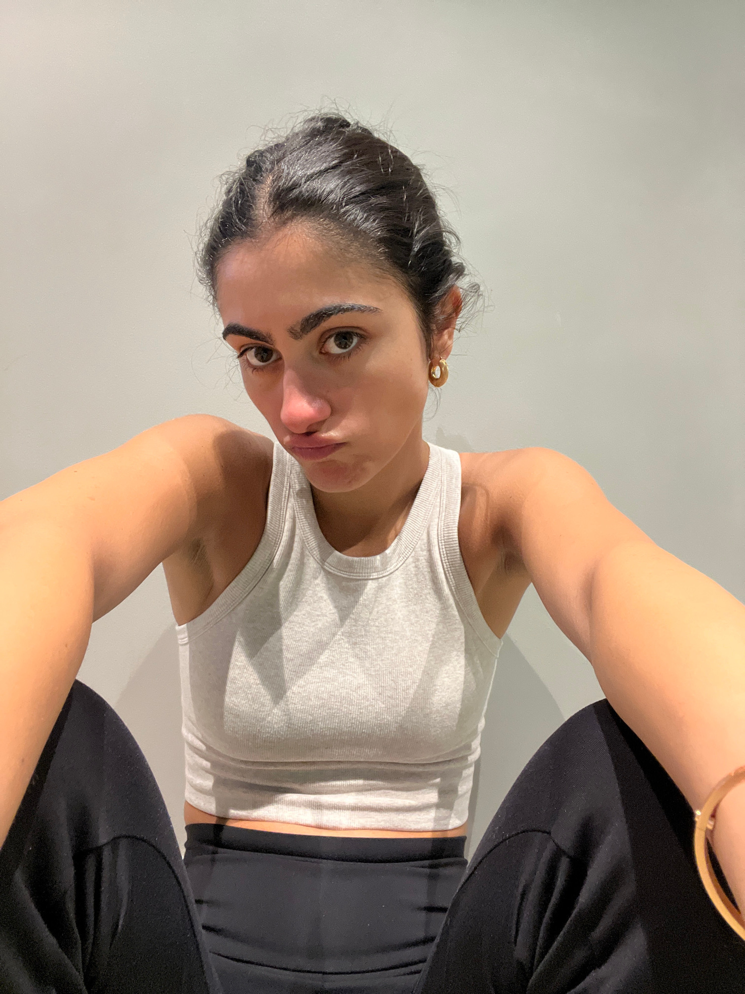 A woman with dark hair pulled back from her face, wearing a light gray tank top and black pants, is sitting with her knees up, looking at the camera. She is wearing a gold earring and a gold bracelet.…read more