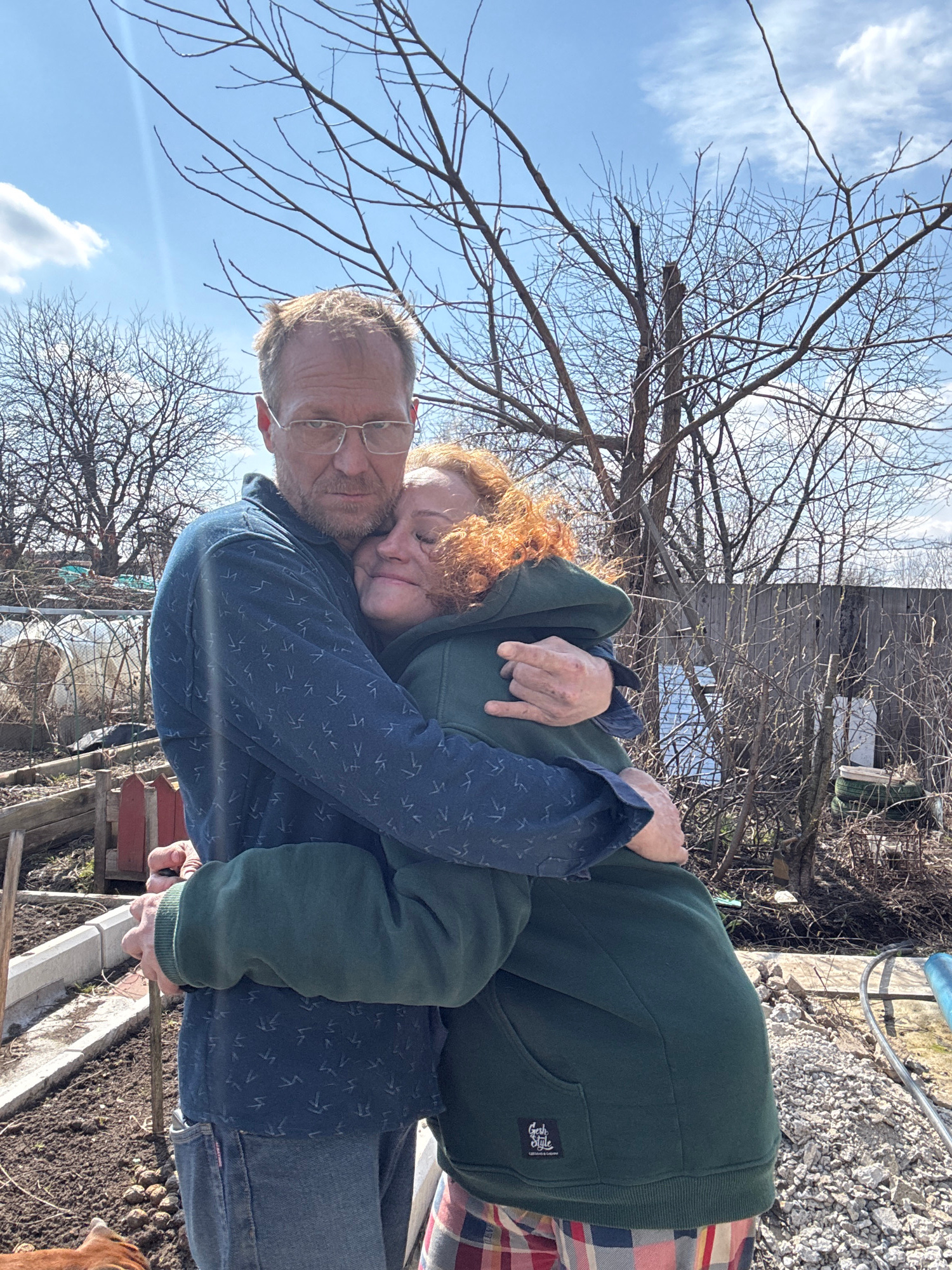 An affectionate moment between a man and a woman is captured in this outdoor vertical shot, likely in a backyard or garden in Chaikovsky, Russia. The image is rotated 90 degrees counter-clockwise from…read more