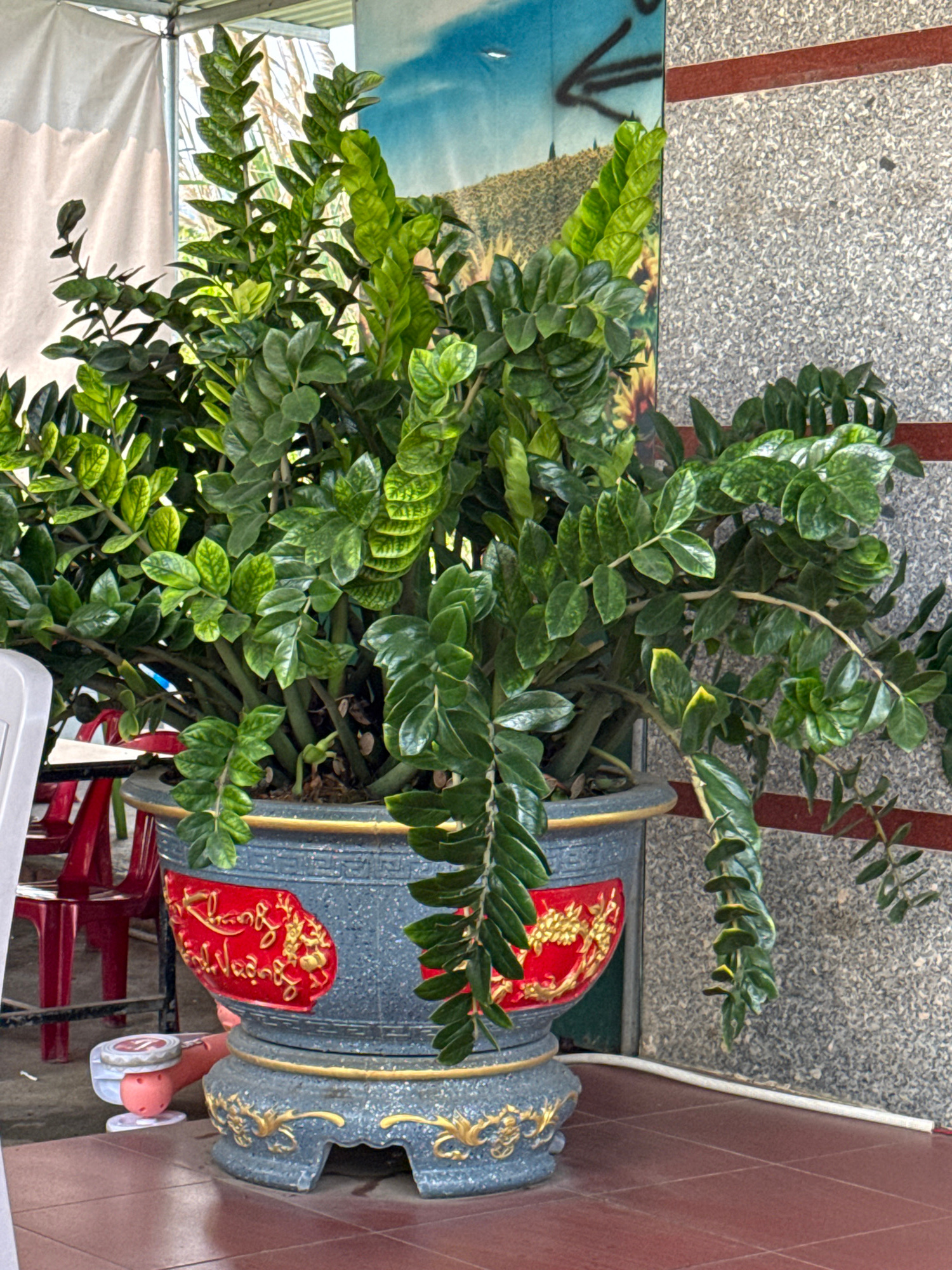 The image shows a lush green plant, likely a Zamioculcas zamiifolia (ZZ plant), overflowing from a decorative, grey-speckled pot with red and gold accents. The pot rests on a dark metal stand. Backgroβ¦read more
