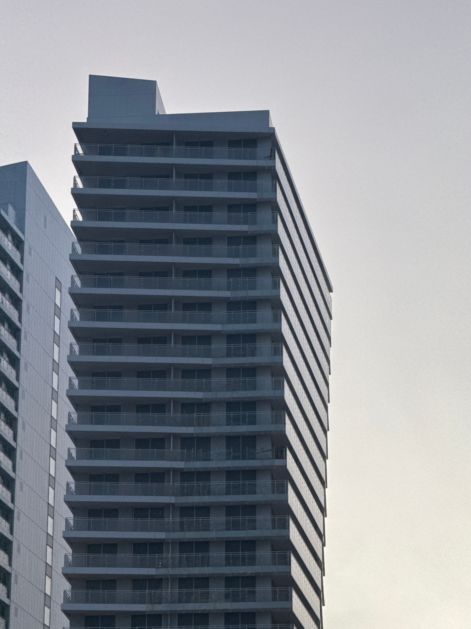 An eye-level, exterior shot shows the upper portion of a modern building in Bat Yam, Israel. The building features a striking, repetitive architectural design with long, dark gray or blue rectangular…read more