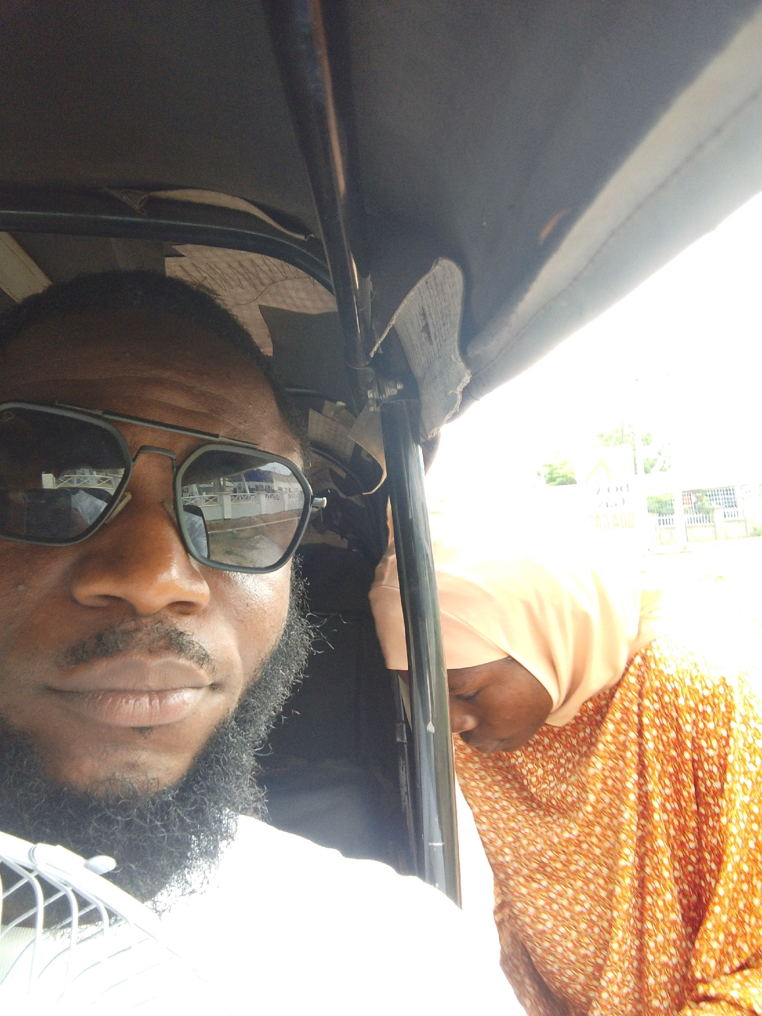 A selfie photograph shows a man with dark skin and a beard, wearing dark sunglasses, inside a vehicle. To the right, a woman wearing a peach-colored hijab and an orange patterned dress is visible. The…read more