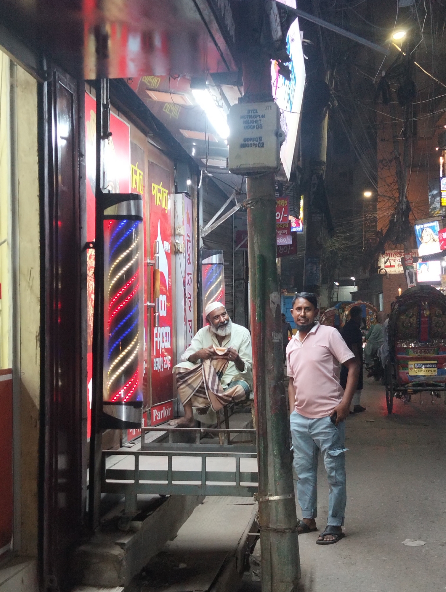The image shows a street scene in Dhaka, Bangladesh, featuring a barber shop and a rickshaw. In the foreground, a man in a pink polo shirt and blue cargo pants stands casually with his hand in his poc…read more