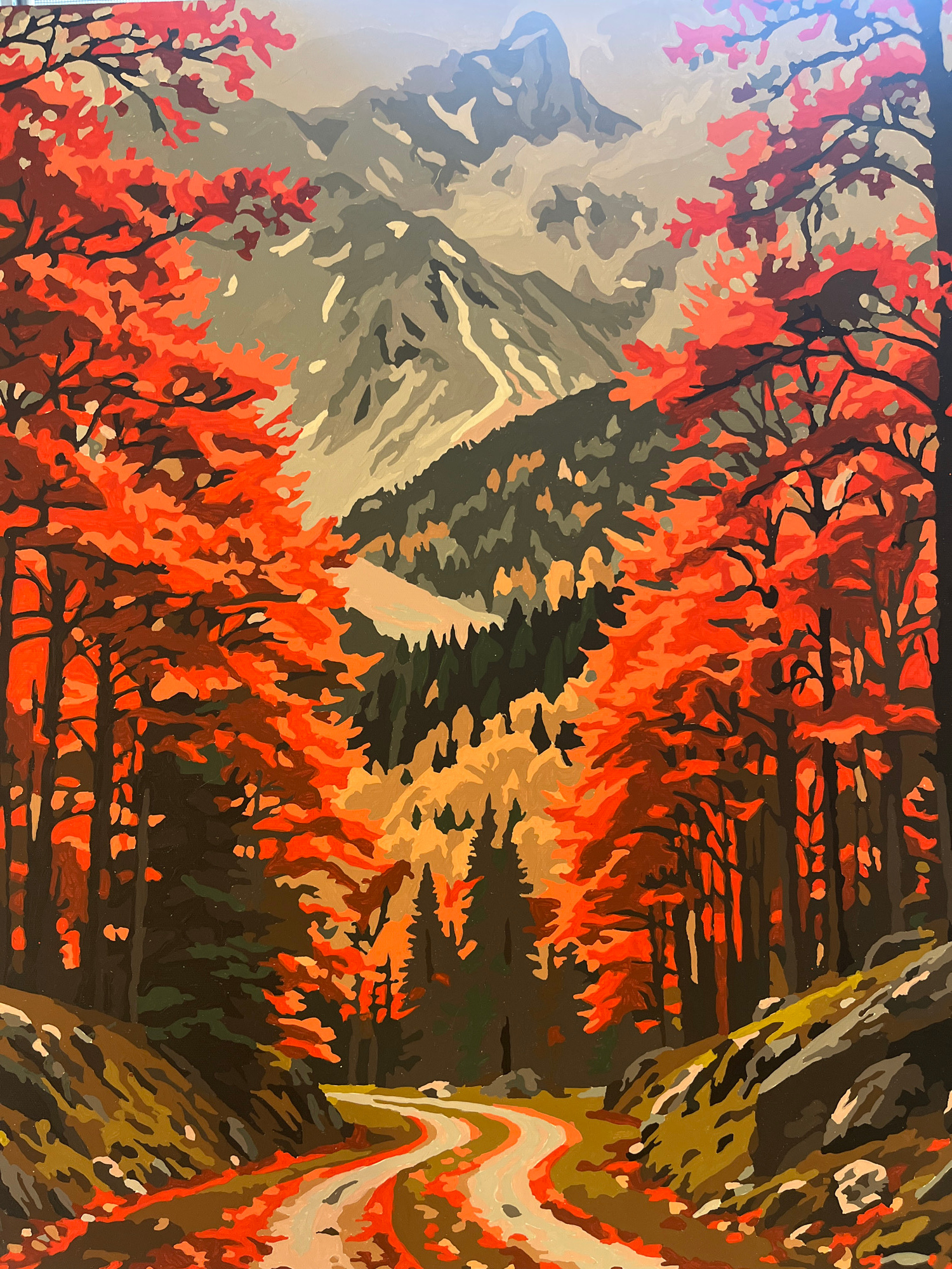 The image shows a stylized painting of a mountain landscape with trees in autumn colors. The mountains are gray with variations in shade to represent depth. The trees in the foreground and middle grou…read more