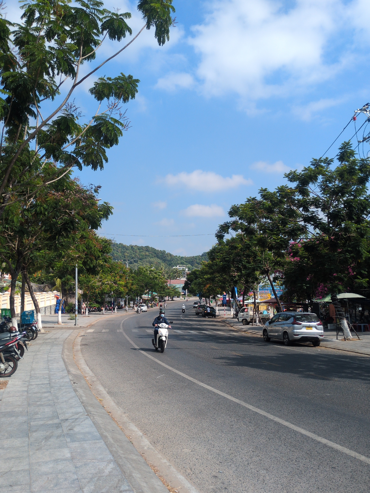The image depicts a street scene in Phú Quốc, Vietnam, showcasing a road curving towards the horizon, bordered by sidewalks and trees. A white-helmeted person rides a scooter down the road, which also…read more