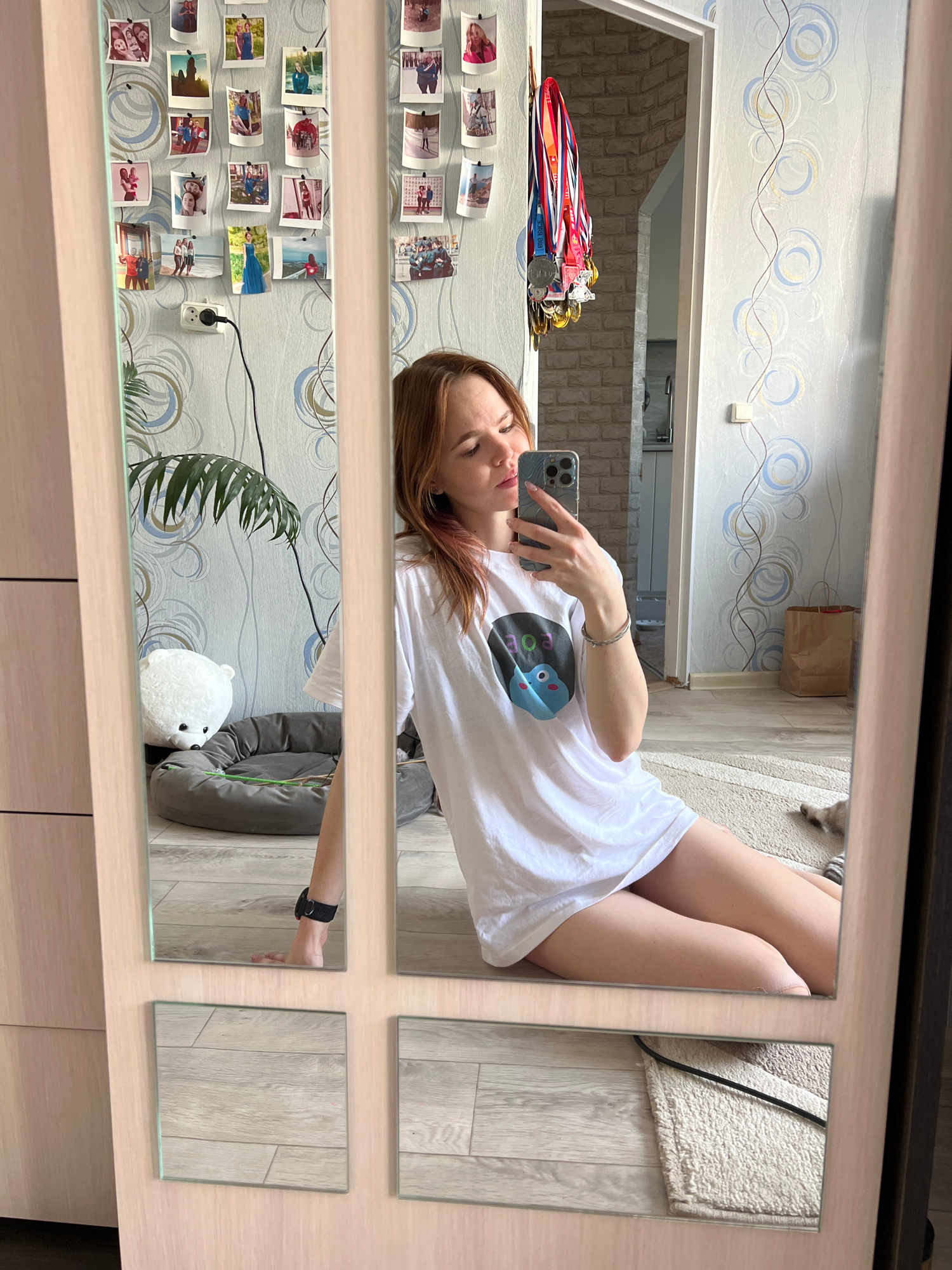 The image shows a selfie of a woman reflected in a multi-paneled mirror. The woman is lying down, holding her phone up to take the picture. She is wearing a white t-shirt. Behind the woman, the refle…read more