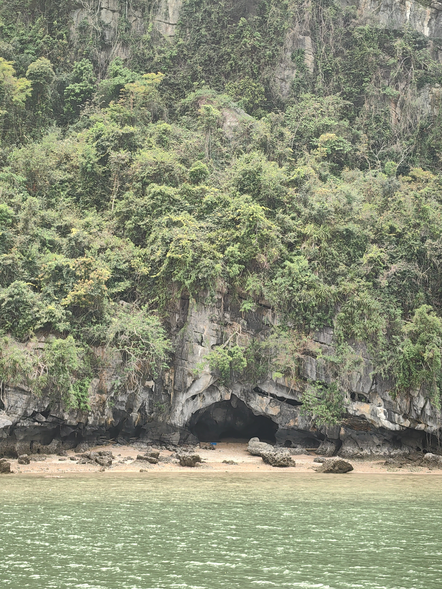 The image shows a rocky cliff face covered in dense vegetation, including trees, shrubs, and vines. At the base of the cliff is a small beach with sand and rocks. A cave entrance is visible in the roc…read more