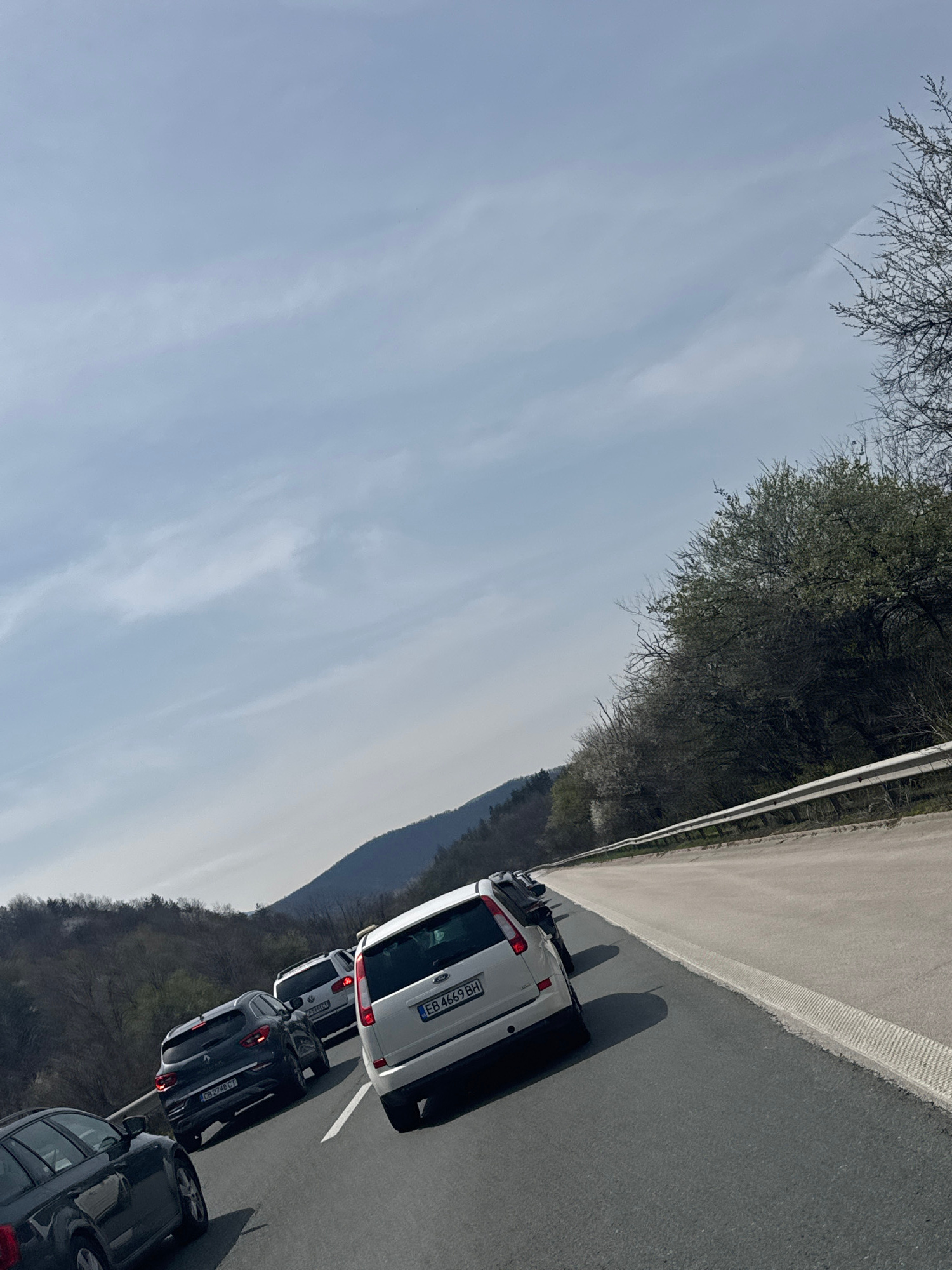 The image shows a road in Trudovets, Bulgaria, with at least four cars parked on the right-hand side. The cars are various colors, including white, black, and dark grey. The license plate of the white…read more