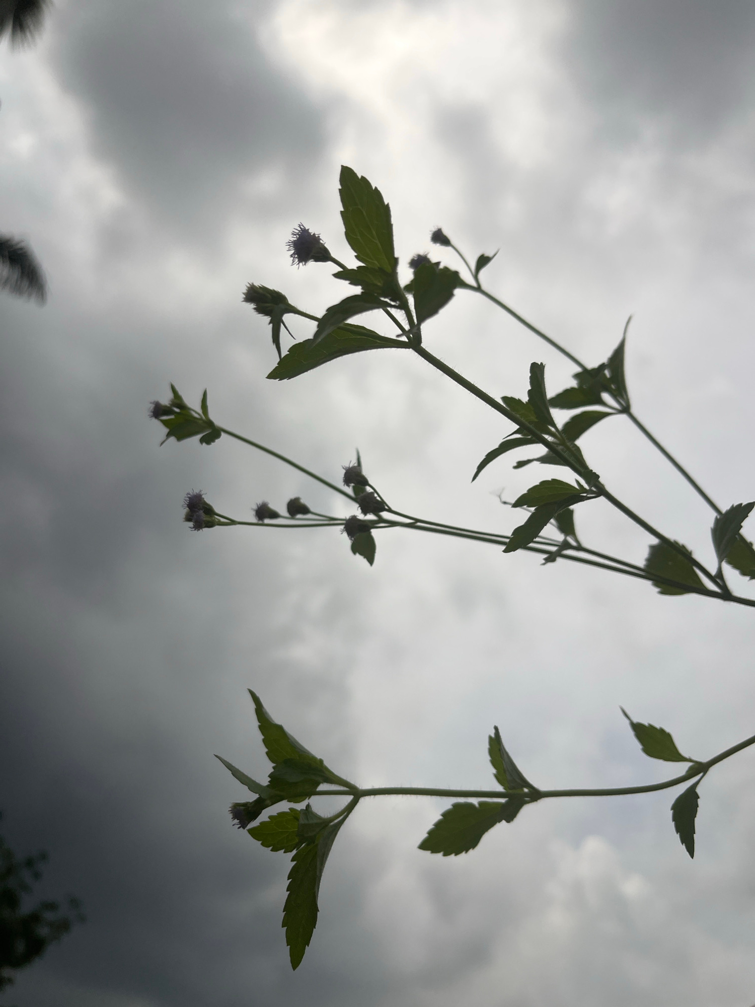 The image presents a low-angle perspective, looking up at several plant stems with leaves and small flowers silhouetted against a cloudy sky. The plants are positioned in the upper portion of the fram…read more