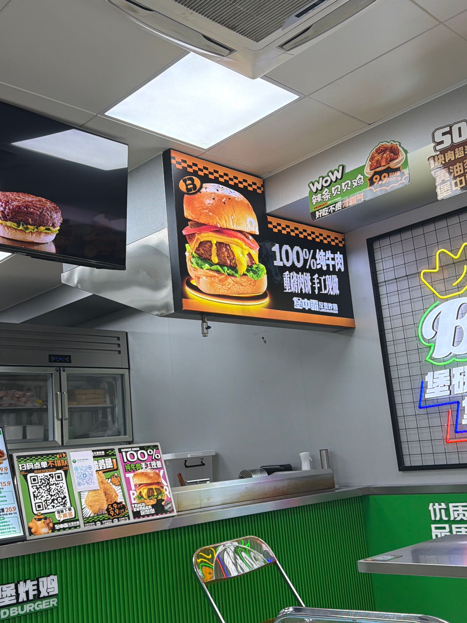 Here's a concise description of the image: The image shows an interior view of a restaurant named "LORD BURGER" in Jiangning District, China. Visible are promotional posters advertising menu items su…read more