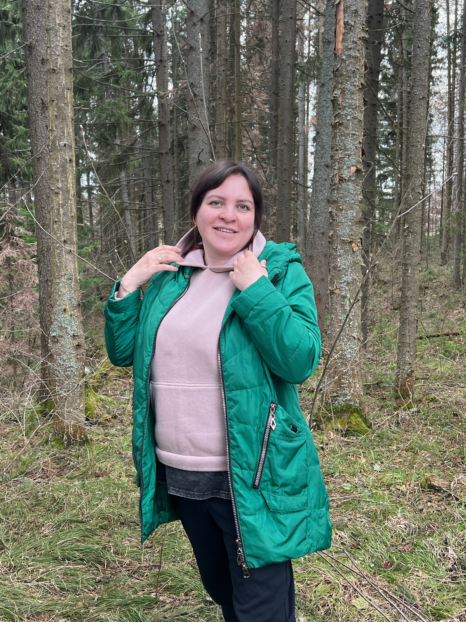 A woman is standing in a forest in Bol'shakino, Russia. She is wearing a green puffer jacket over a light pink hoodie and black pants. The forest is characterized by tall, thin trees and ground cover…read more
