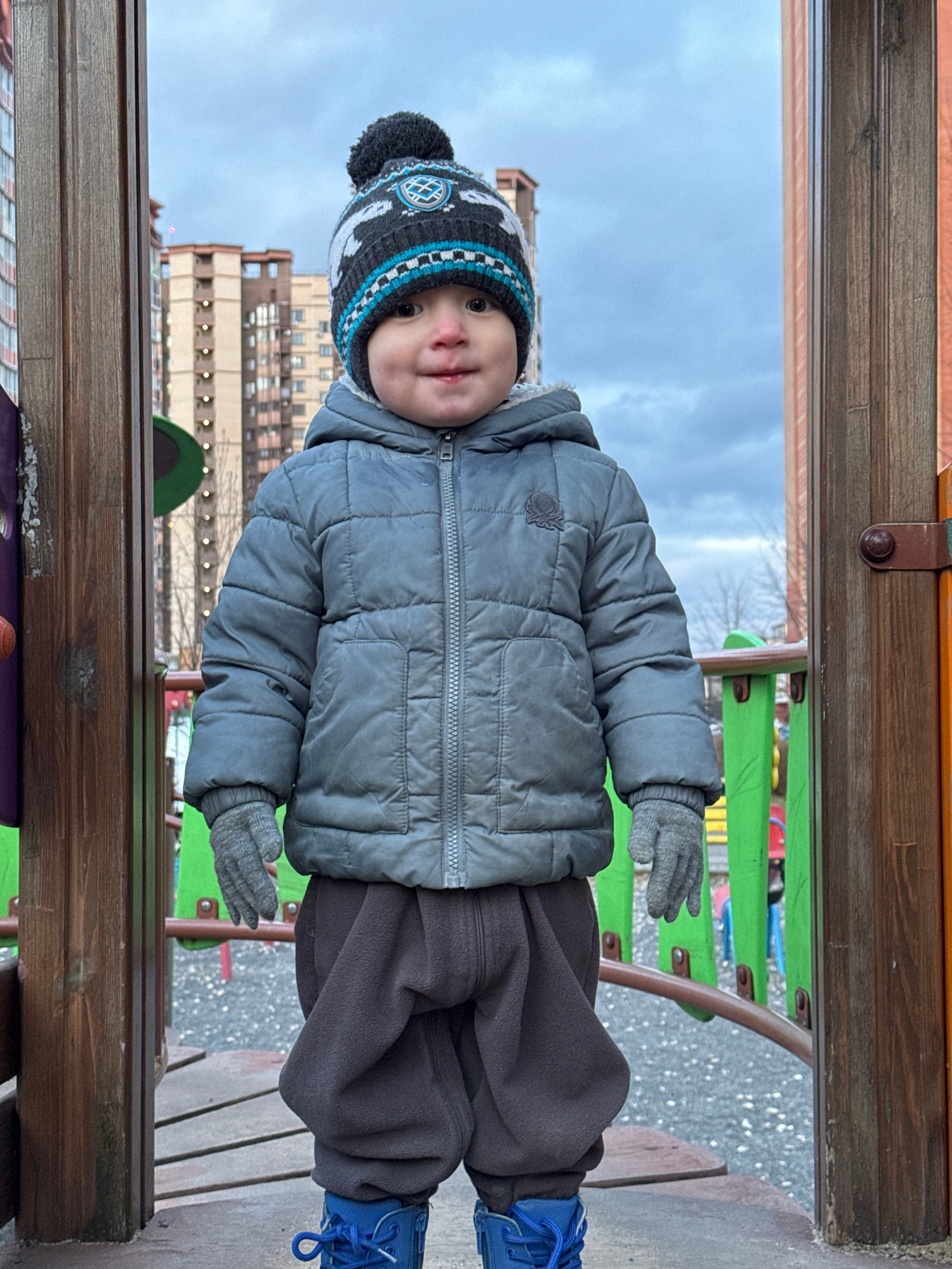 A child in winter clothing stands on a playground structure. The child wears a gray puffer jacket, dark pants, a patterned winter hat with a pom-pom, gray gloves, and blue shoes. The background shows…read more