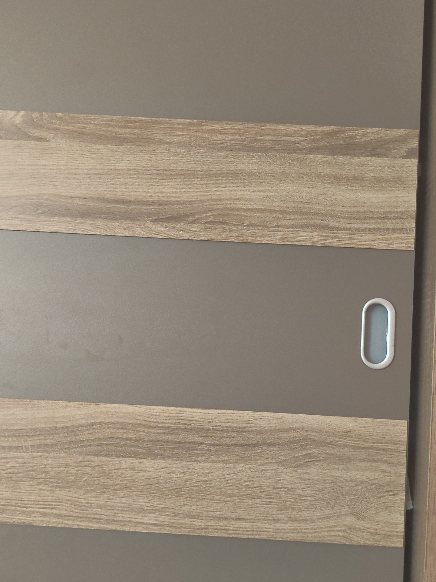 The image shows a close-up of a cabinet or drawer front. The surface is composed of three vertical panels. The central panel is a uniform, muted brown color and features a horizontally oriented, reces…read more