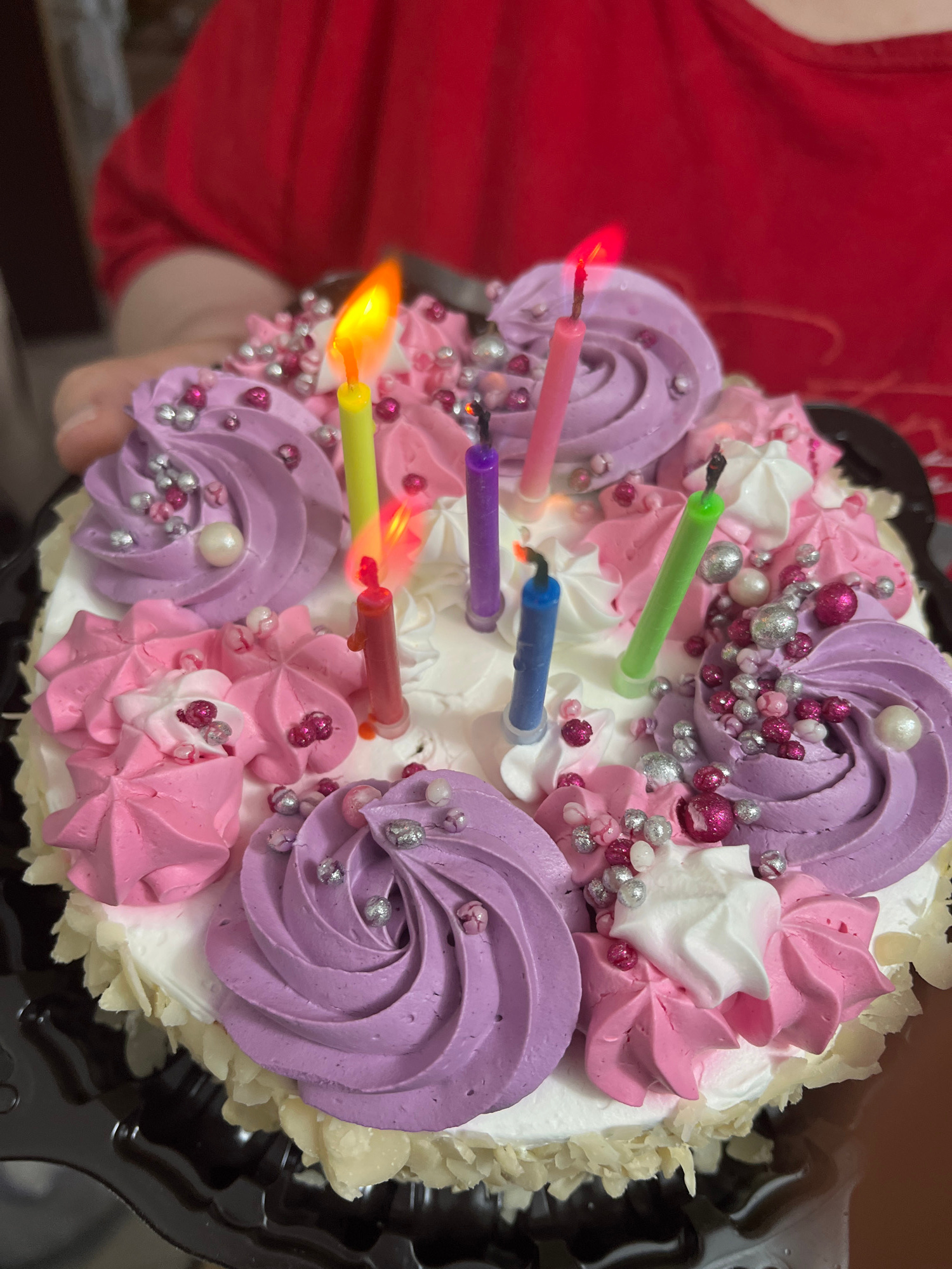 The image shows a decorated birthday cake with lit candles. The cake has white icing and is decorated with swirls of purple, pink, and white frosting. Silver and pink edible decorations are scattered…read more