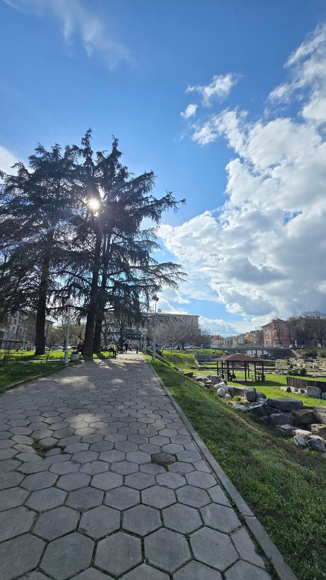 The image depicts a park scene in Stara Zagora, Bulgaria, with a paved walkway composed of hexagonal concrete blocks extending from the bottom right corner towards the center of the frame. Along the l…read more