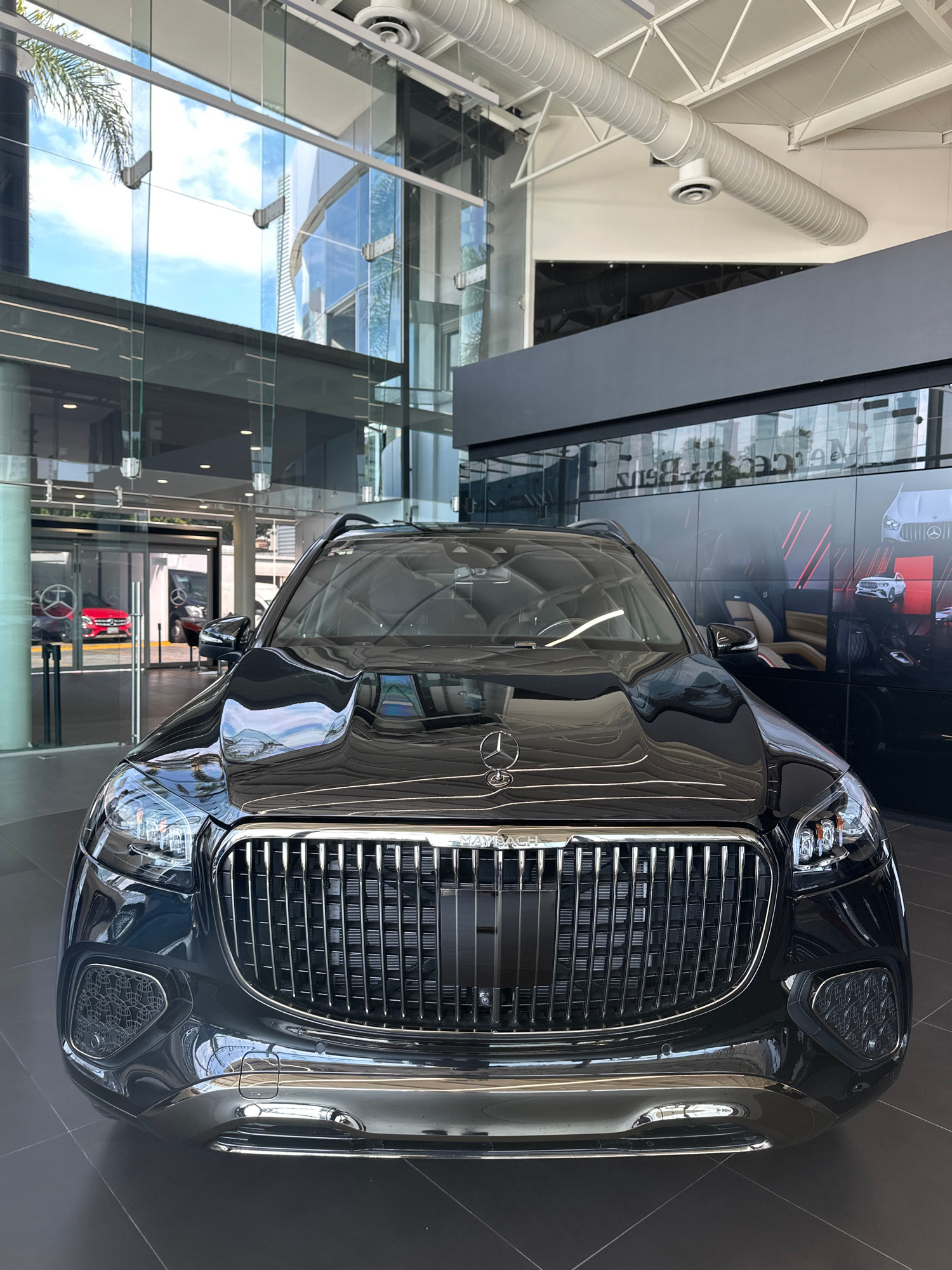 A black Maybach automobile is displayed in a modern building in San Bernardino Tlaxcalancingo, Mexico. The vehicle's front grill and headlights are visible. The building features glass walls that refl…read more