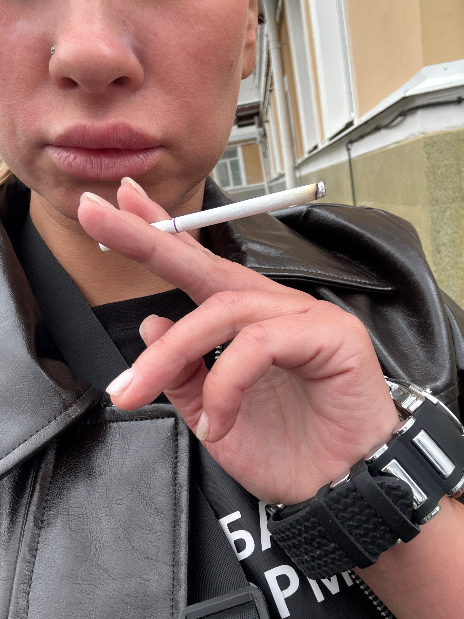 A close-up, portrait-oriented shot features a person, likely female, from the nose down. The individual's fair skin, plump lips, and a small stud piercing below the lower lip are prominent. Light-colo…read more