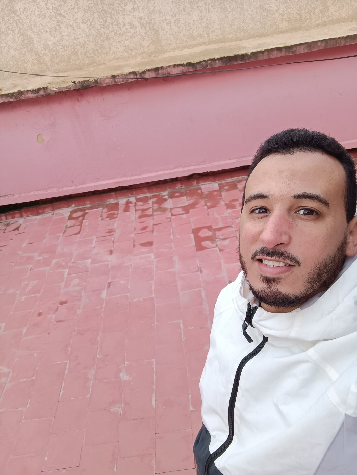 A man with dark hair and a beard stands on a red tiled surface. He wears a white and gray jacket with a black zipper. Above the tiled surface is a pink wall or ledge, topped by a beige or off-white su…read more