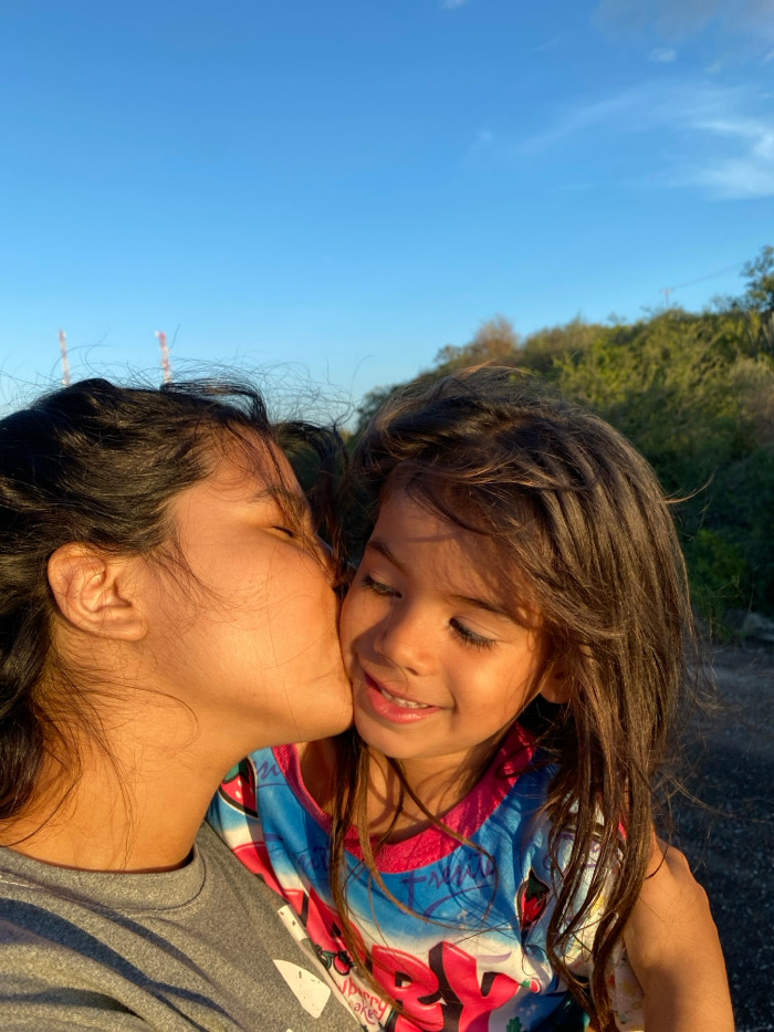 A young girl with long brown hair smiles sweetly, her eyes closed, and leans on another person, possibly her mother. The woman, also with dark hair, has her eyes closed and her face tilted upwards. Th…read more