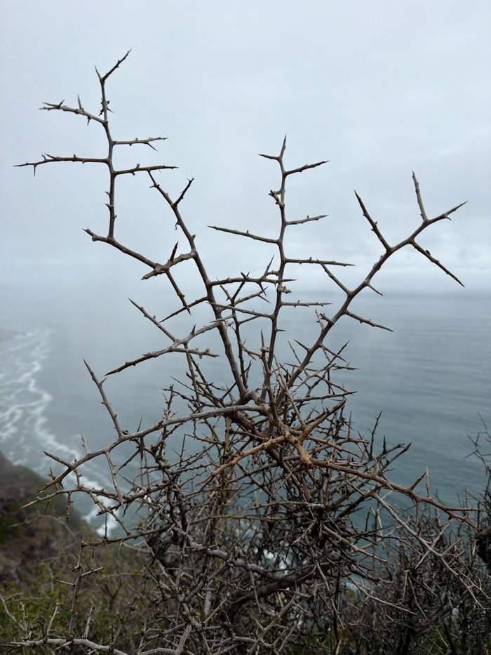 The image displays a coastal scene along the Cape Peninsula in Cape Town, South Africa, under an overcast sky. In the foreground and extending into the mid-ground, a dense, leafless shrub features num…read more