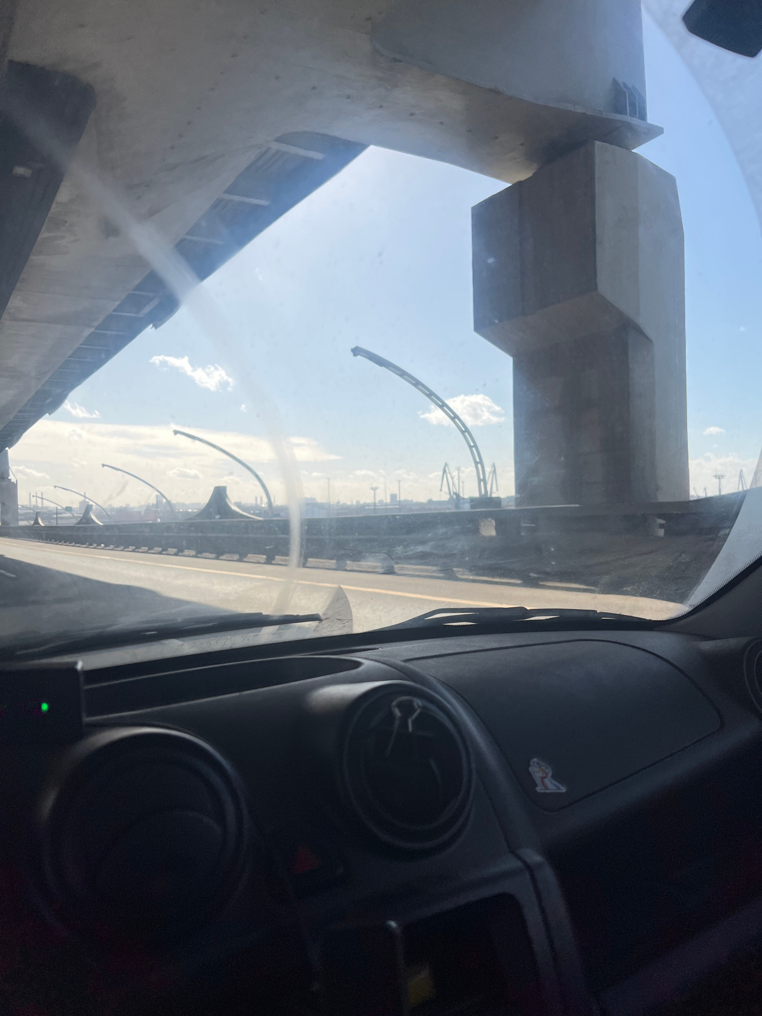 The image shows a view from inside a vehicle, likely a car, looking out the windshield. The vehicle is passing under a concrete structure, possibly an elevated roadway or bridge. The outside scene fea…read more