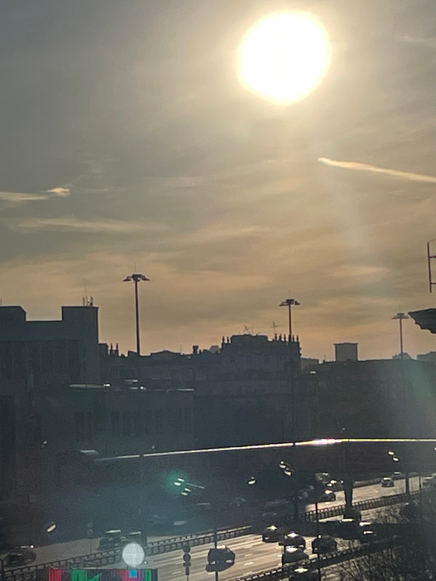 The image depicts an urban or suburban landscape during either sunrise or sunset in Khimki, Russia, characterized by strong backlighting and silhouetted elements. On the left, a brilliant, round sun g…read more